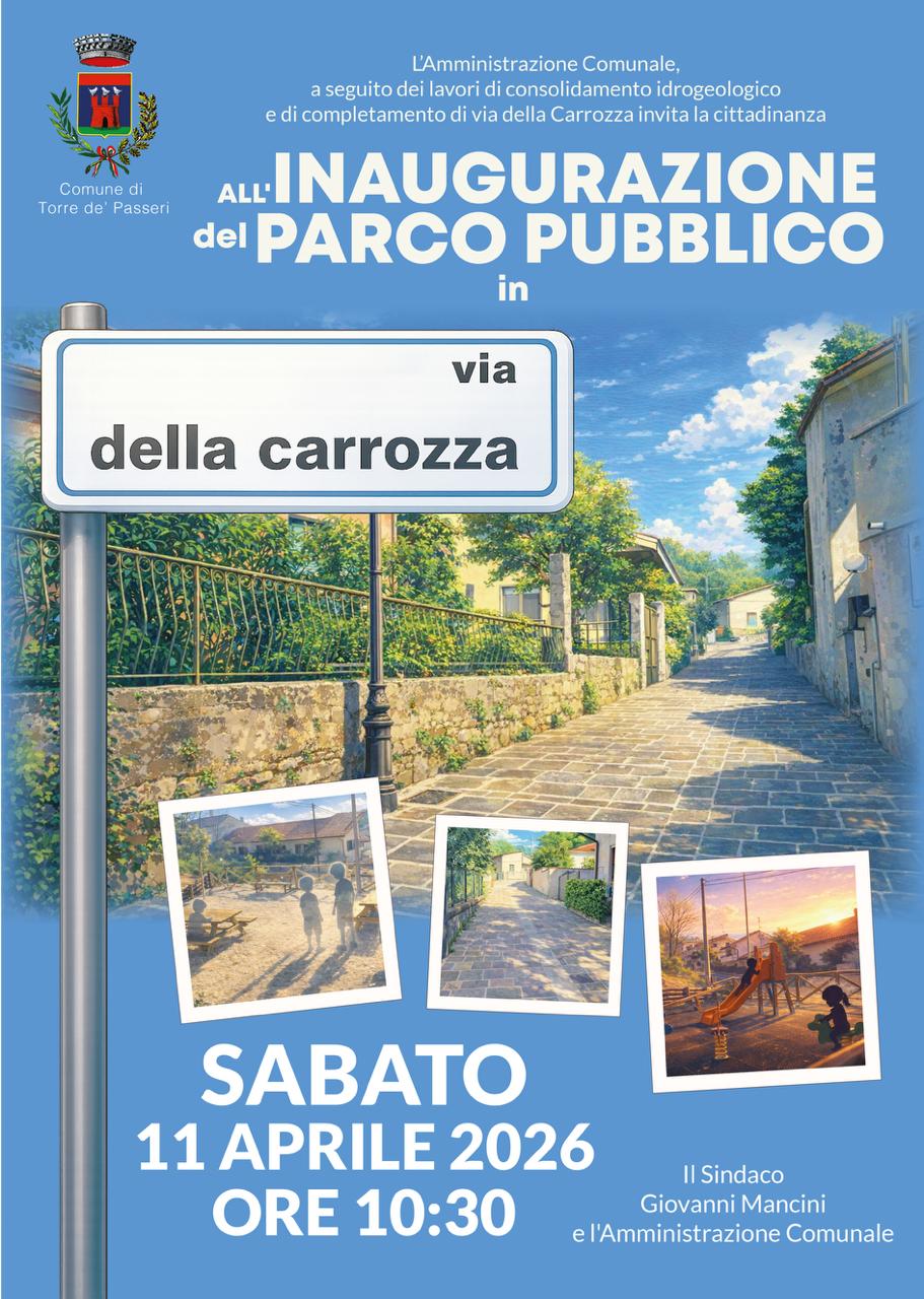 L'Amministrazione comunale, guidata dal sindco Giovanni Mancini, invita la cittadinanza e le scolaresche a partecipare alla festa inaugurale che si terrà sabato 11 aprile 2026 alle ore 10.30 lungo via della Carrozza, che sale verso il castello Gizzi.