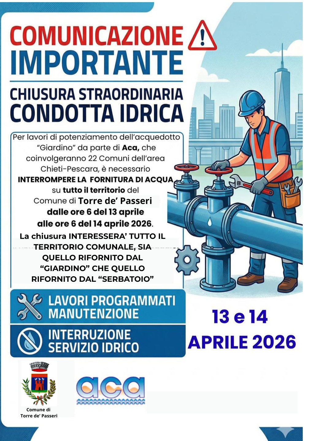 Il Comune di Torre de' Passeri ha emesso due ordinanze: la numero 13 del 9 aprile 2026 riguardante il divieto temporaneo di utilizzo dell'acqua di rubinetto destinata al consumo quotidiano (vedi link):