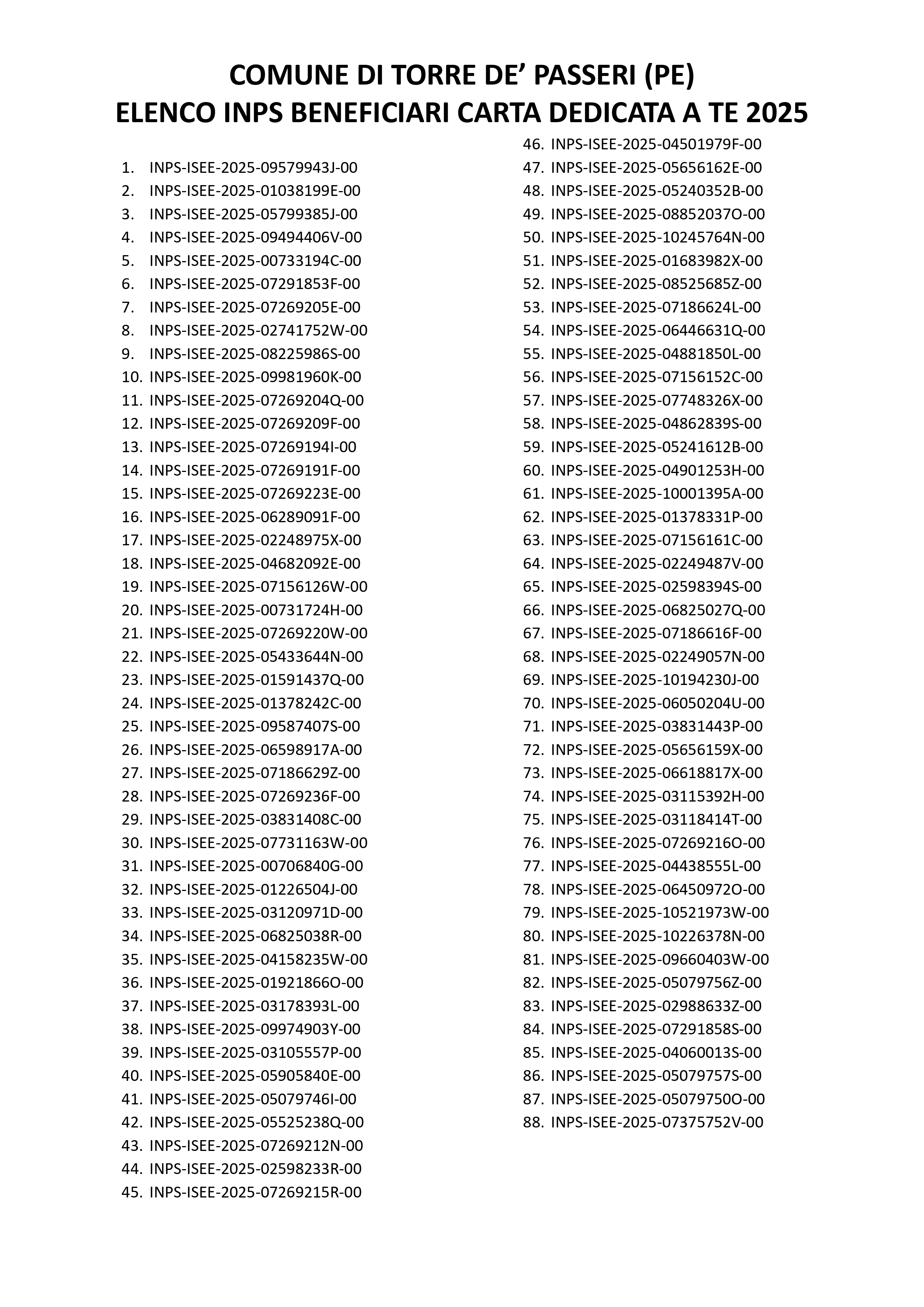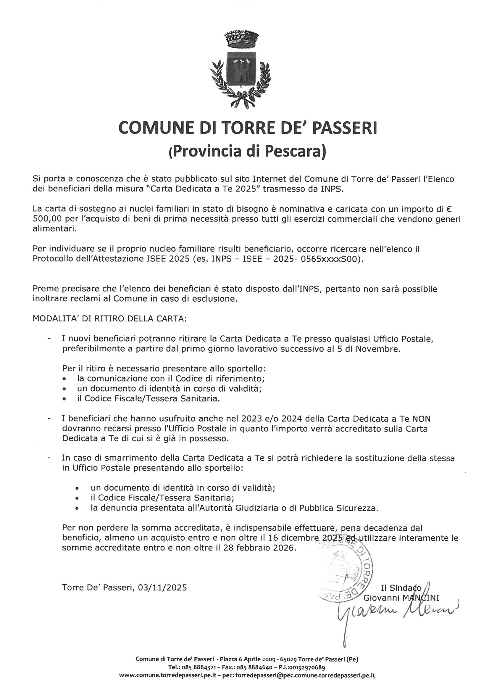 Il Comune di Torre de' Passeri pubblica l'elenco dei beneficiari, selezionati e disposti dall’Inps, residenti in questo Comune, della misura “Carta Dedicata a Te 2025”.
