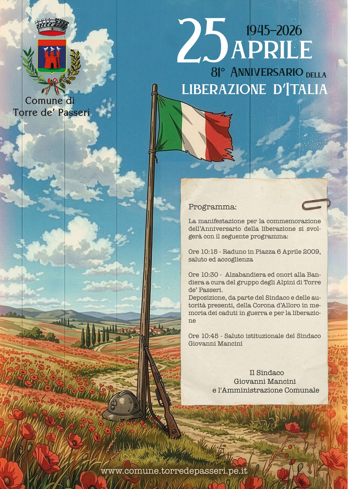 Il Comune di Torre de’ Passeri si prepara alle celebrazioni dell’81° anniversario della festa della Liberazione, la giornata simbolo della Libertà e della rinascita democratica del nostro Paese. E' l'occasione per ricordare insieme i valori della Resistenza, rendere omaggio a chi ha lottato per la libertà e rinnovare il nostro impegno civile.