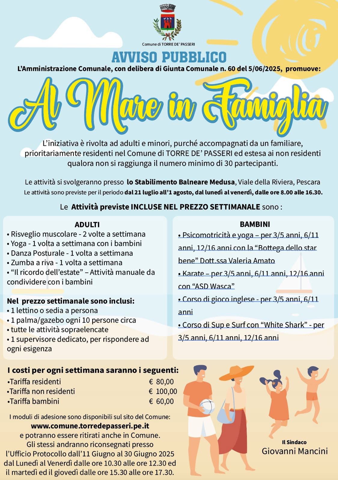 L'iniziativa è una ulteriore offerta ludica-educativa voluta dall'Amministrazione (delibera n.60 del 5 giugno 2025) per dare possibilità ai genitori, zii, nonni, di trascorrere del tempo al mare insieme a figli e nipoti.