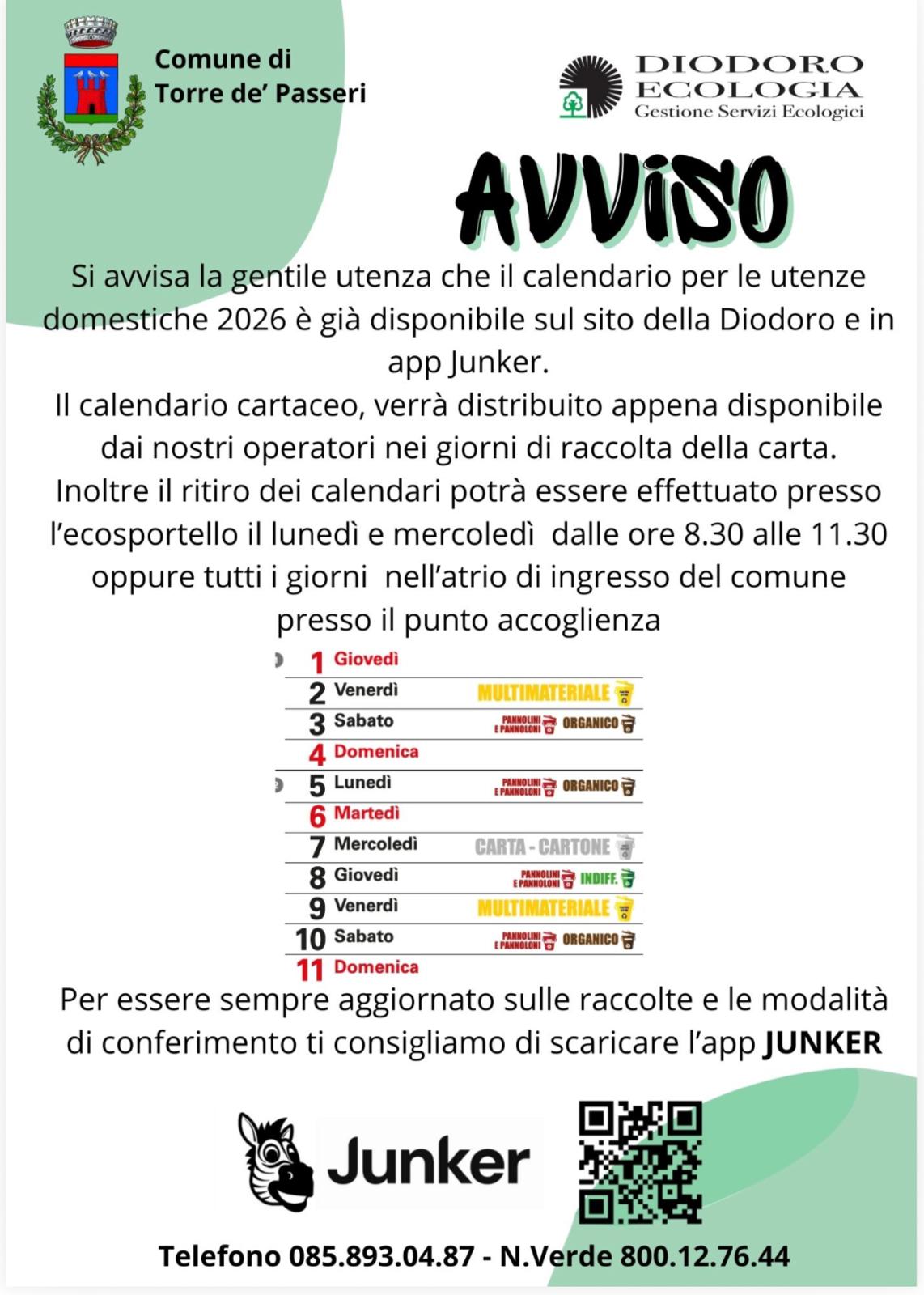 Il Comune di Torre de' Passeri e la Diodoro Ecologia, la società che si occupa della raccolta dei rifiuti, comunicano ai cittadini che il calendario della programmazione della raccolta rifiuti per l'anno 2026 è già disponibile online sul sito della Diodoro e su App Junker.
