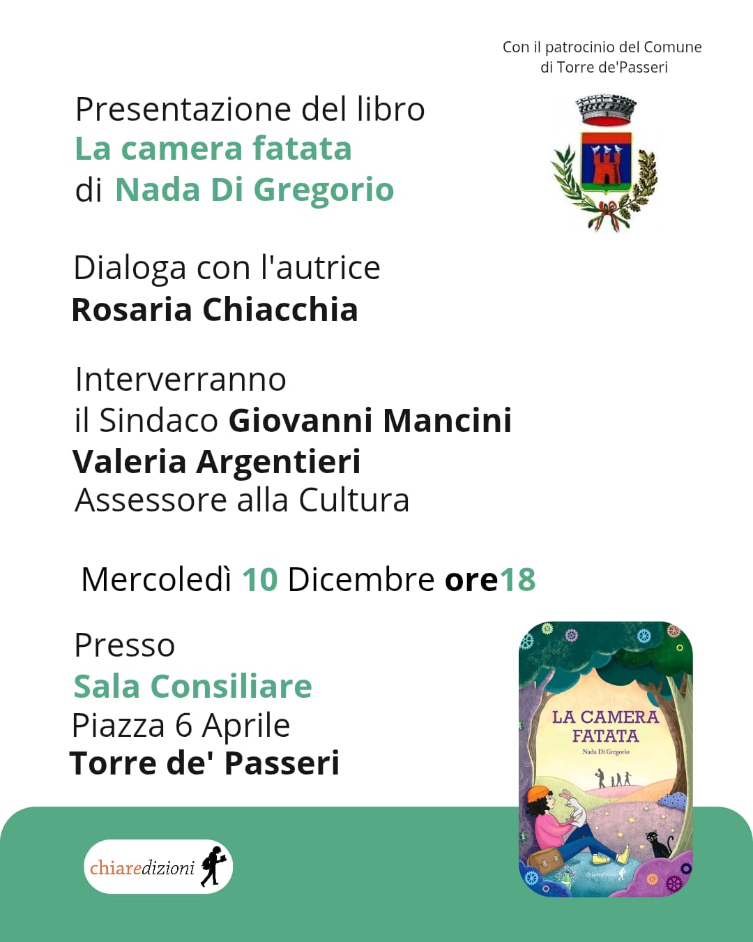 "La camera fatata" è il titolo del libro che sarà presentato mercoledì 10 dicembre 2025 alle ore 18 nella sala Consiliare del Comune di Torre de' Passeri.