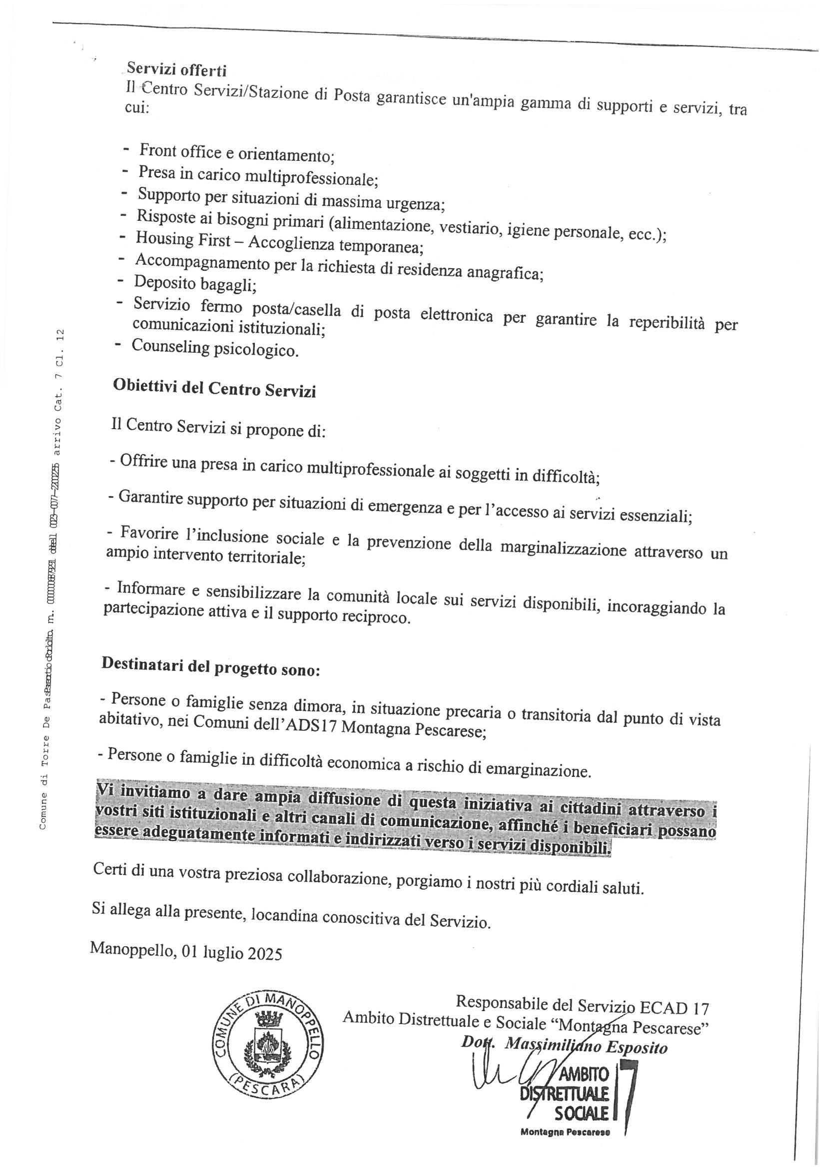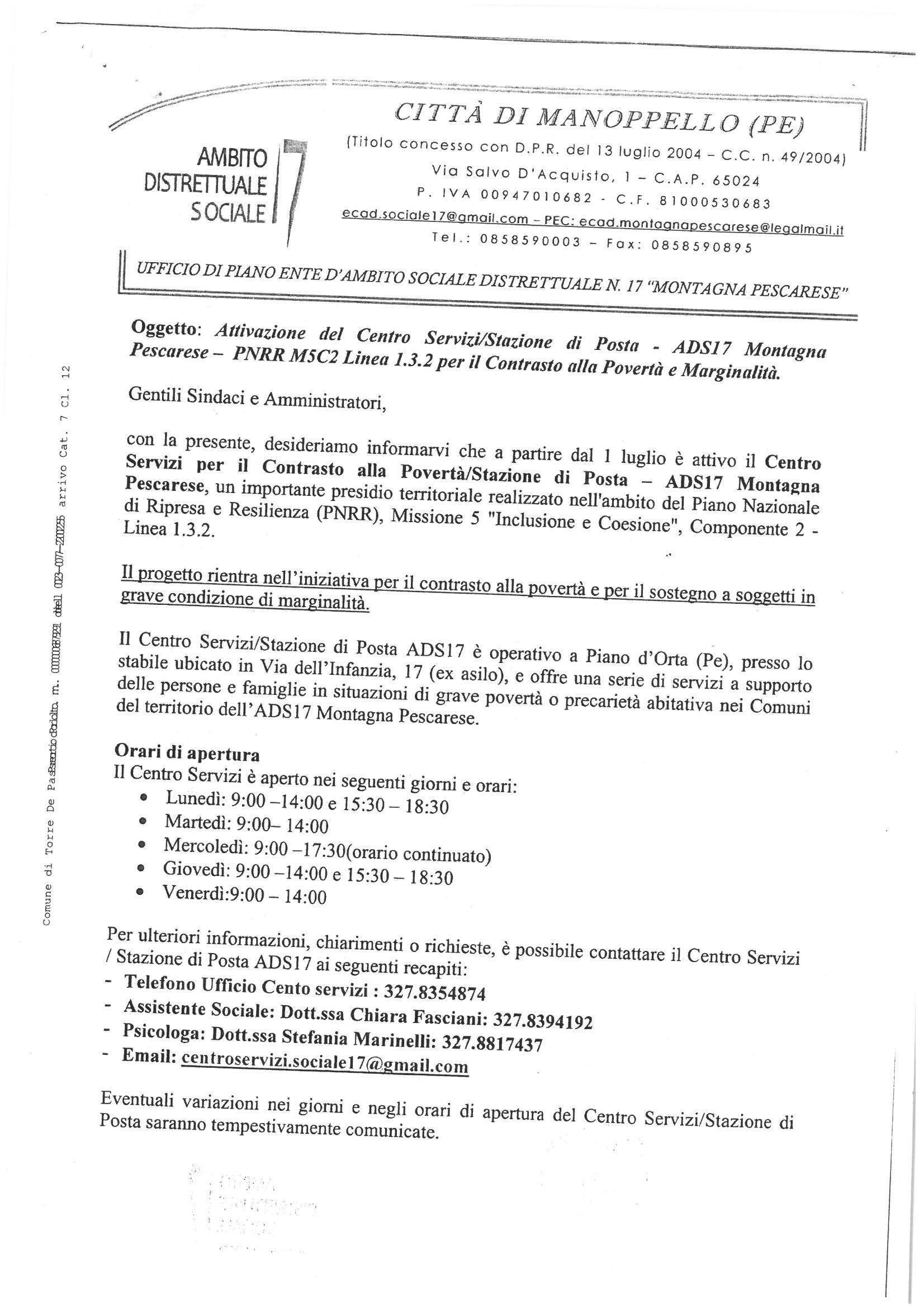 A partire dallo scorso 1 luglio è attivo il Centro servizi per il Contrasto alla povertà/stazione di Posta Ads 17 Montagna Pescarese, un importante presidio territoriale realizzato nell'ambito del Piano Nazionale di Ripresa e Resilienza (Pnrr)