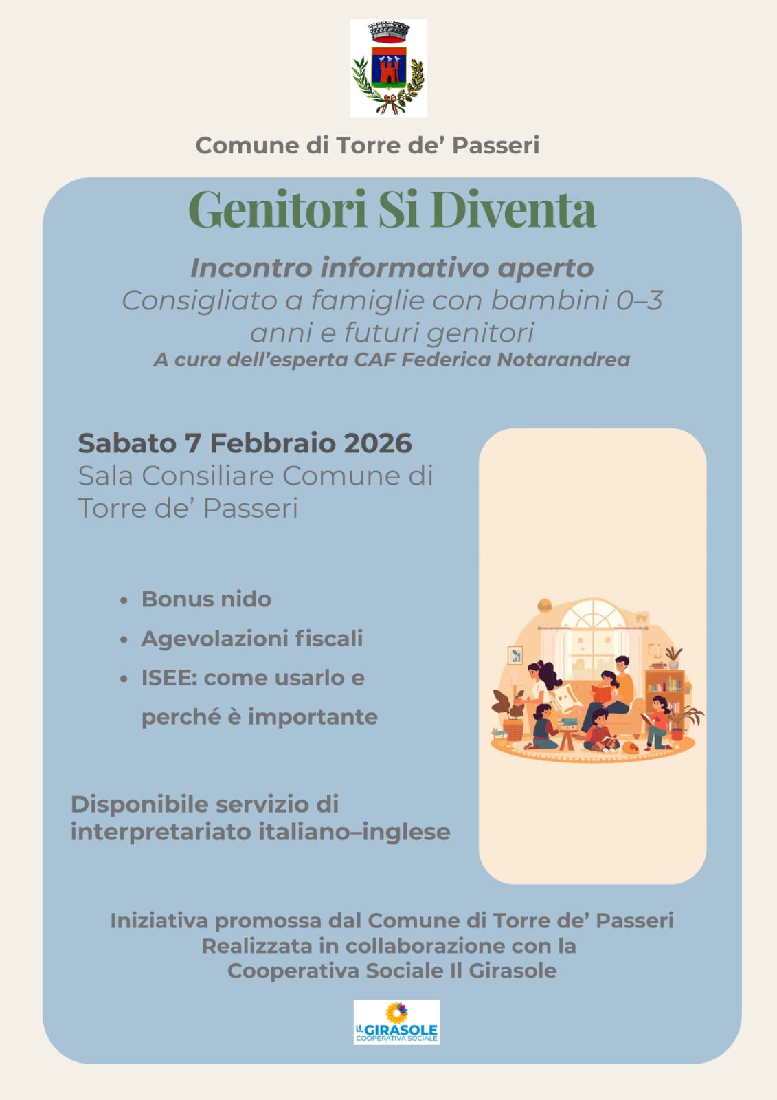 Sabato 7 febbraio 2026 dalle ore 10 in sala consiliare si svolgerà l'iniziativa a cui i genitori, e i futuri genitori, sono invitati a partecipare. Con l'esperta Caf Federica Notarandrea, si parlerà di bonus nido, di agevolazioni fiscali, di Isee come usarlo e perché importante, ma soprattutto <il progetto>, spiegano gli organizzatori, <è una visione educativa condivisa. E' la scelta di sostenere i genitori, senza giudicarli, offrendo strumenti e possibilità per affrontare con consapevolezza, leggerezza e coraggio le sfide della crescita. E' l'idea che nessuno cresce da solo e che per costruire un domani più forte è necessario seminare fiducia, alleanze e cura del presente>.
