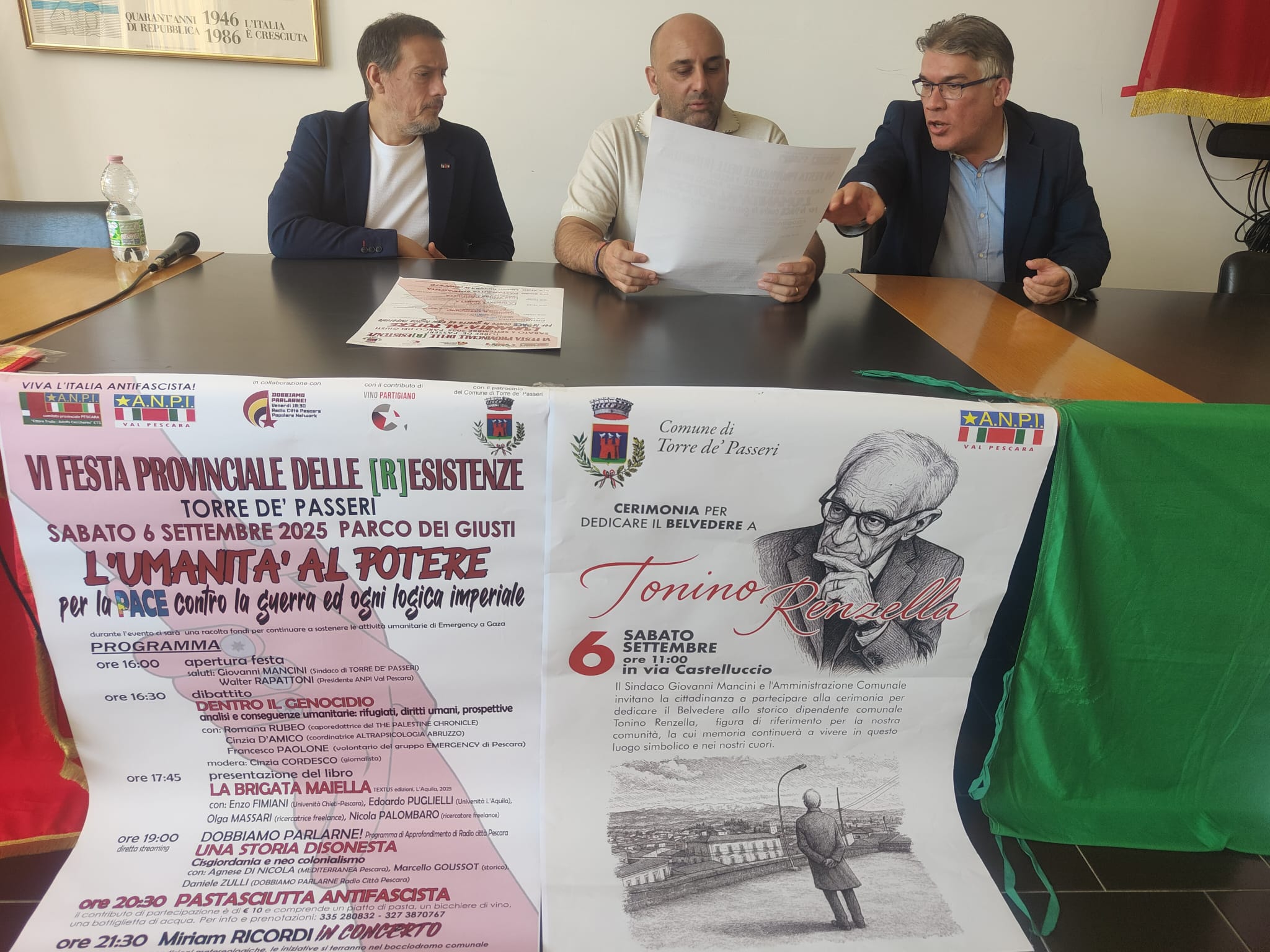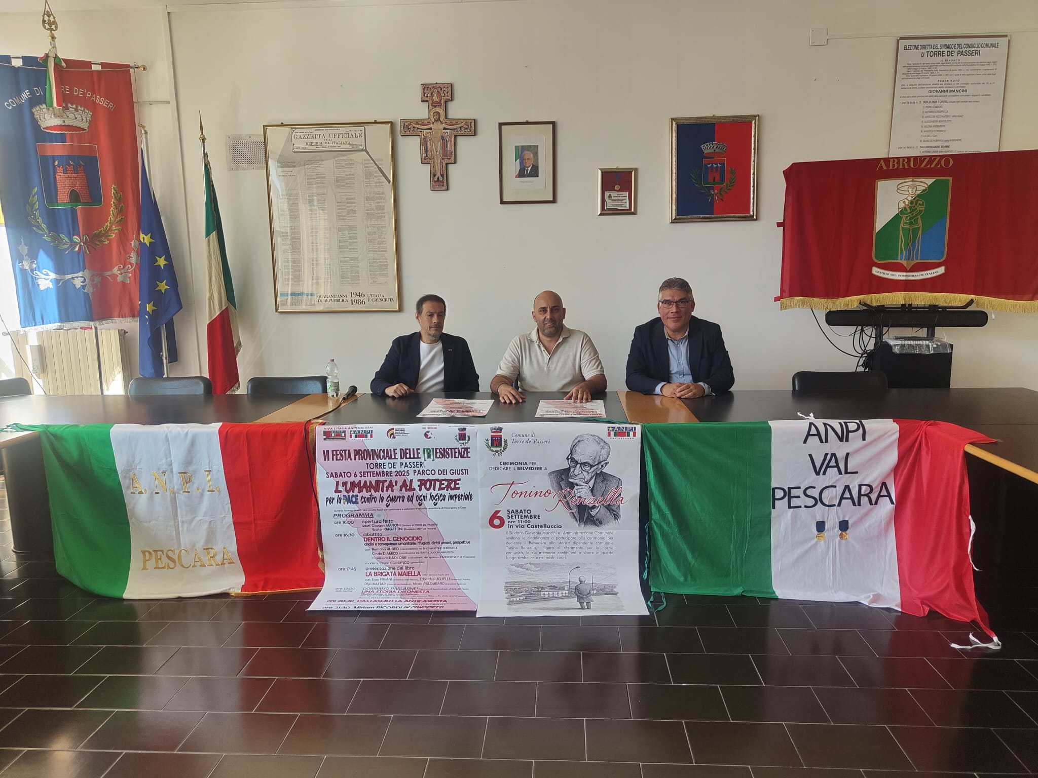 La giornata di celebrazioni inizierà alle ore 11 di sabato 6 settembre 2025 con l'intitolazione, in via Castelluccio, del belvedere dedicato allo storico, e indimenticato, dipendente del Comune di Torre de' Passeri, Tonino Renzella scomparso lo scorso anno. Alla cerimonia saranno presenti il sindaco Giovanni Mancini con il vice, Piero Di Giulio e l'assessore alla Cultura Valeria Argentieri, gli amministratori; il presidente Anpi Val Pescara, Walter Rapattoni; i familiari di Renzella.