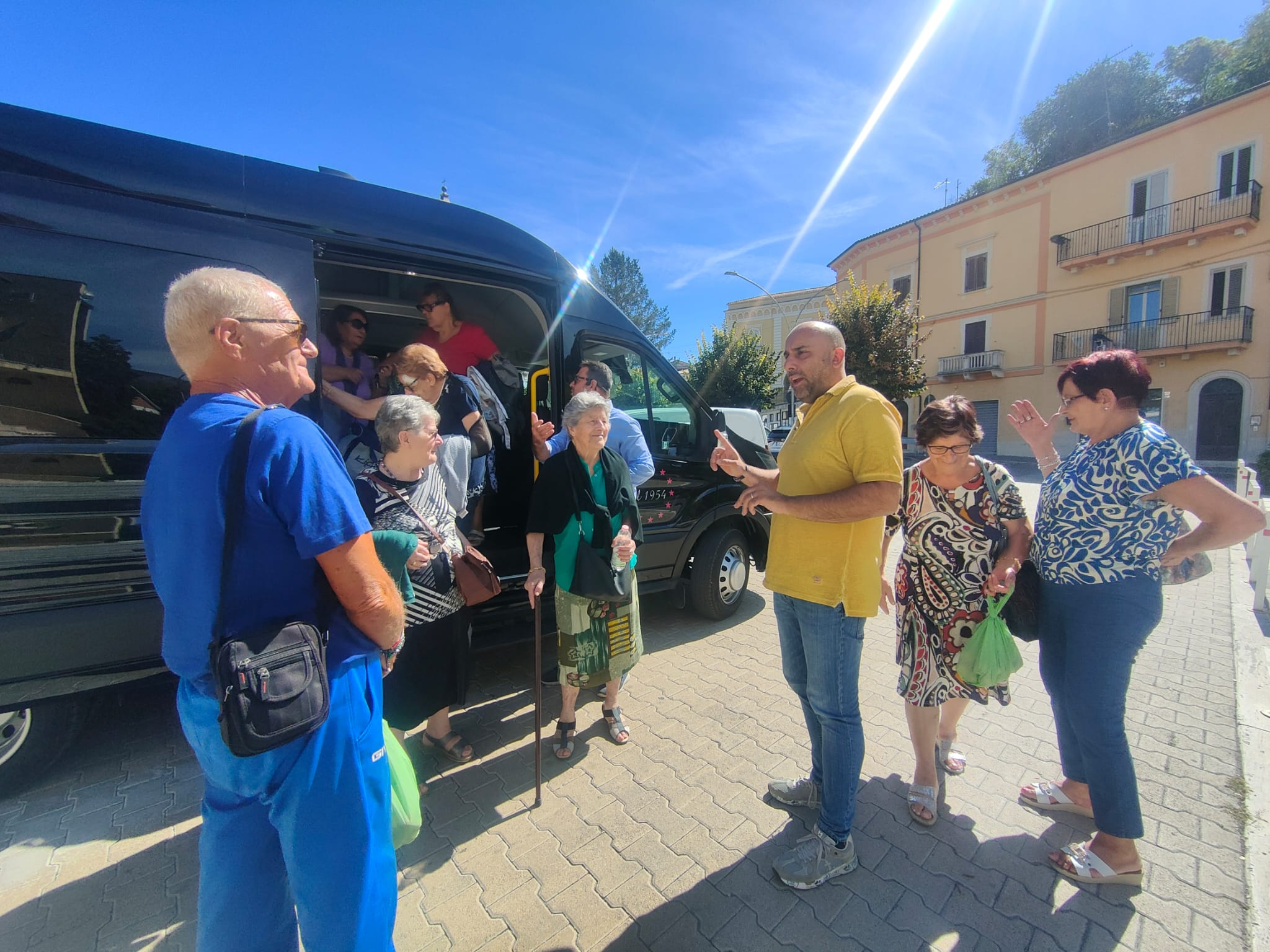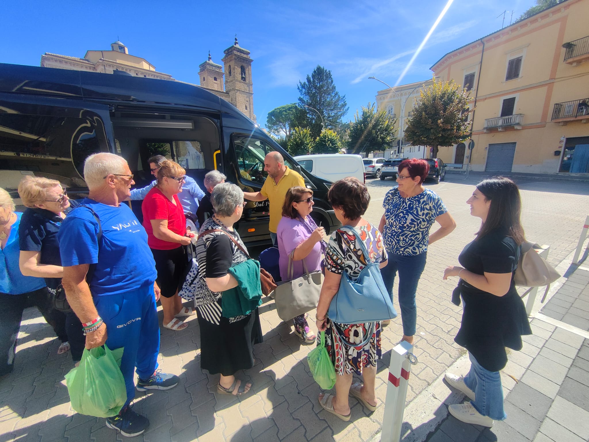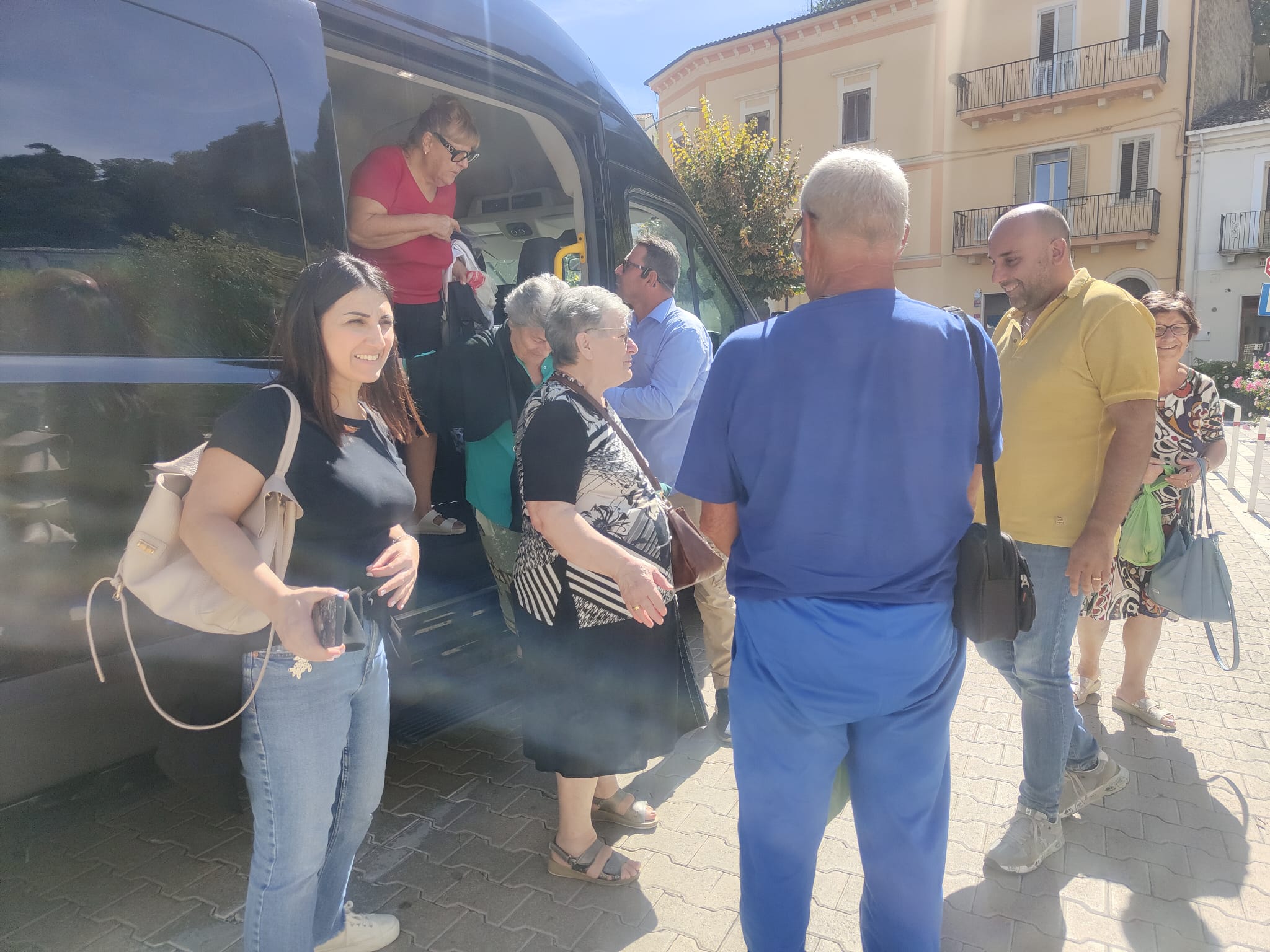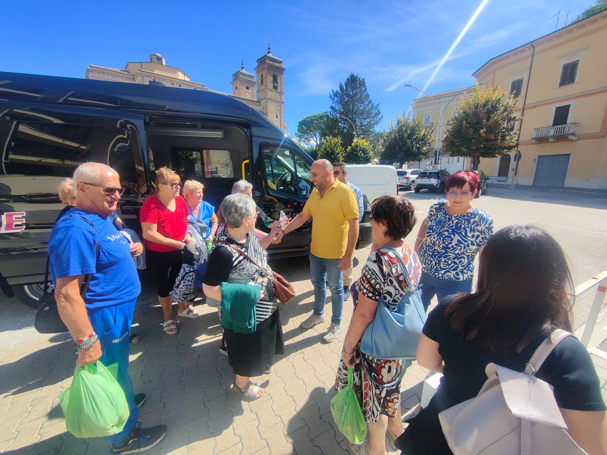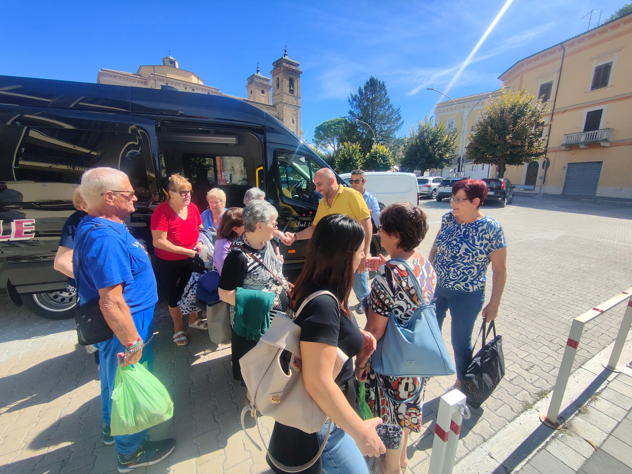 Sono le ore 13 e il sindaco Giovanni Mancini accoglie, nel piazzale antistante il Comune, i partecipanti all'iniziativa "In pullman alle Terme", di ritorno dallo stabilimento termale di Popoli.