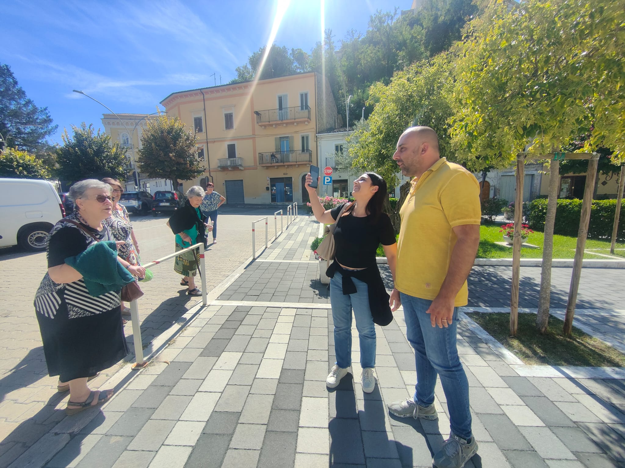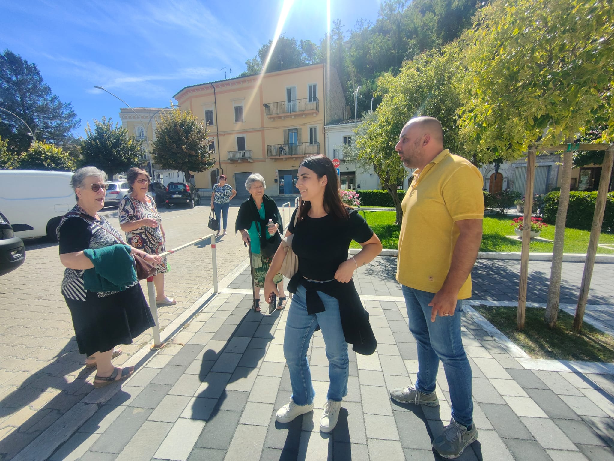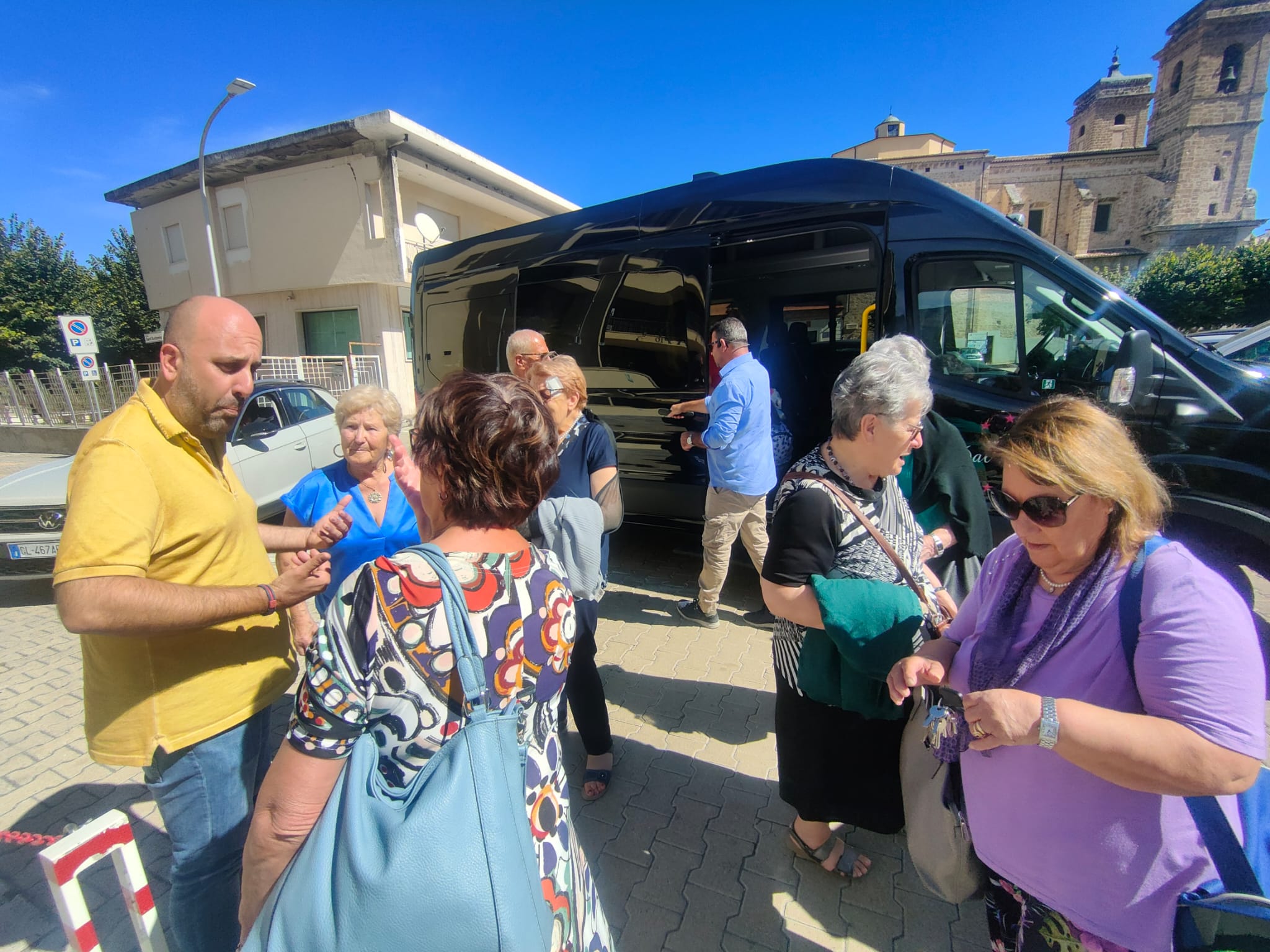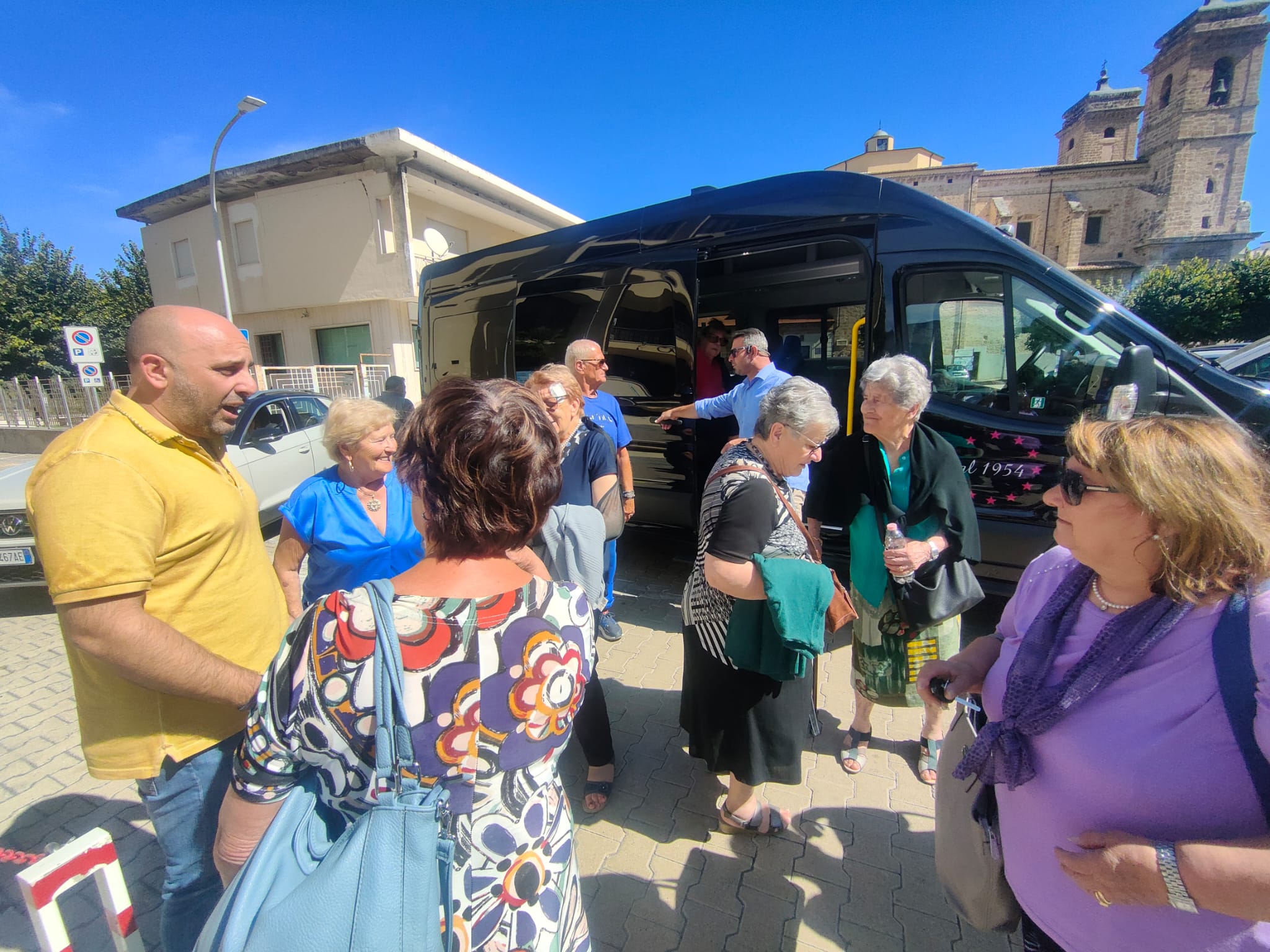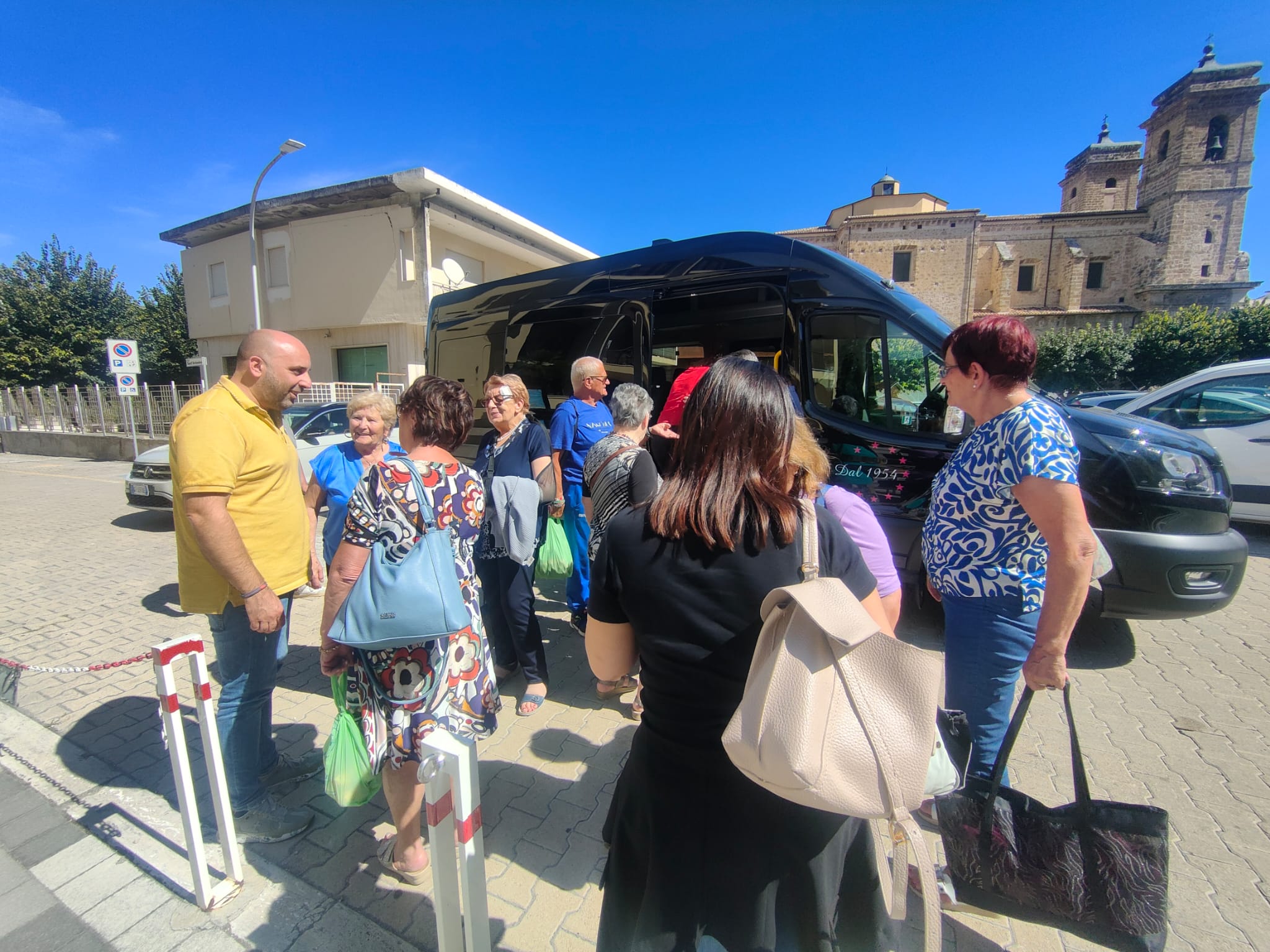 Sono le ore 13 e il sindaco Giovanni Mancini accoglie, nel piazzale antistante il Comune, i partecipanti all'iniziativa "In pullman alle Terme", di ritorno dallo stabilimento termale di Popoli.