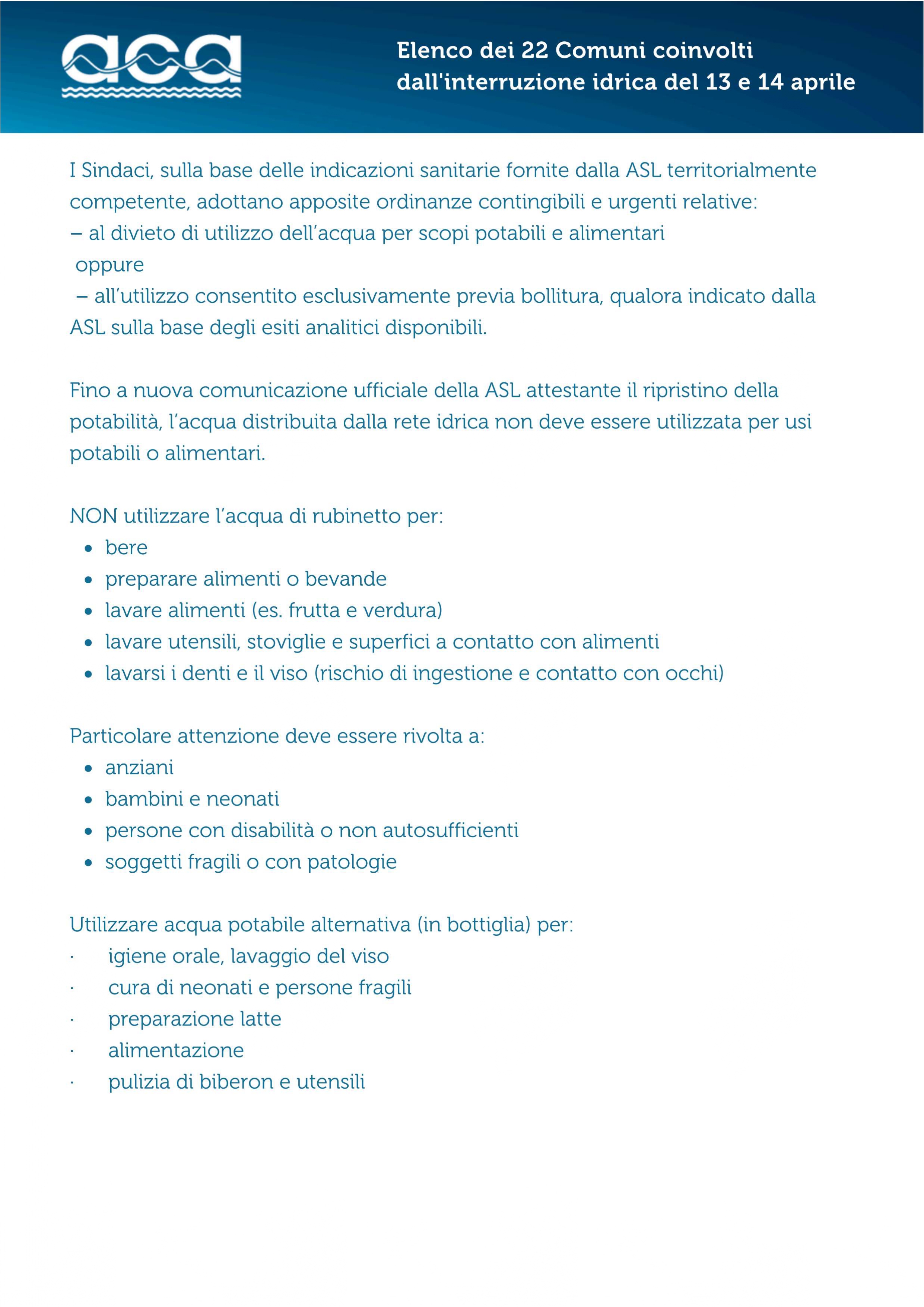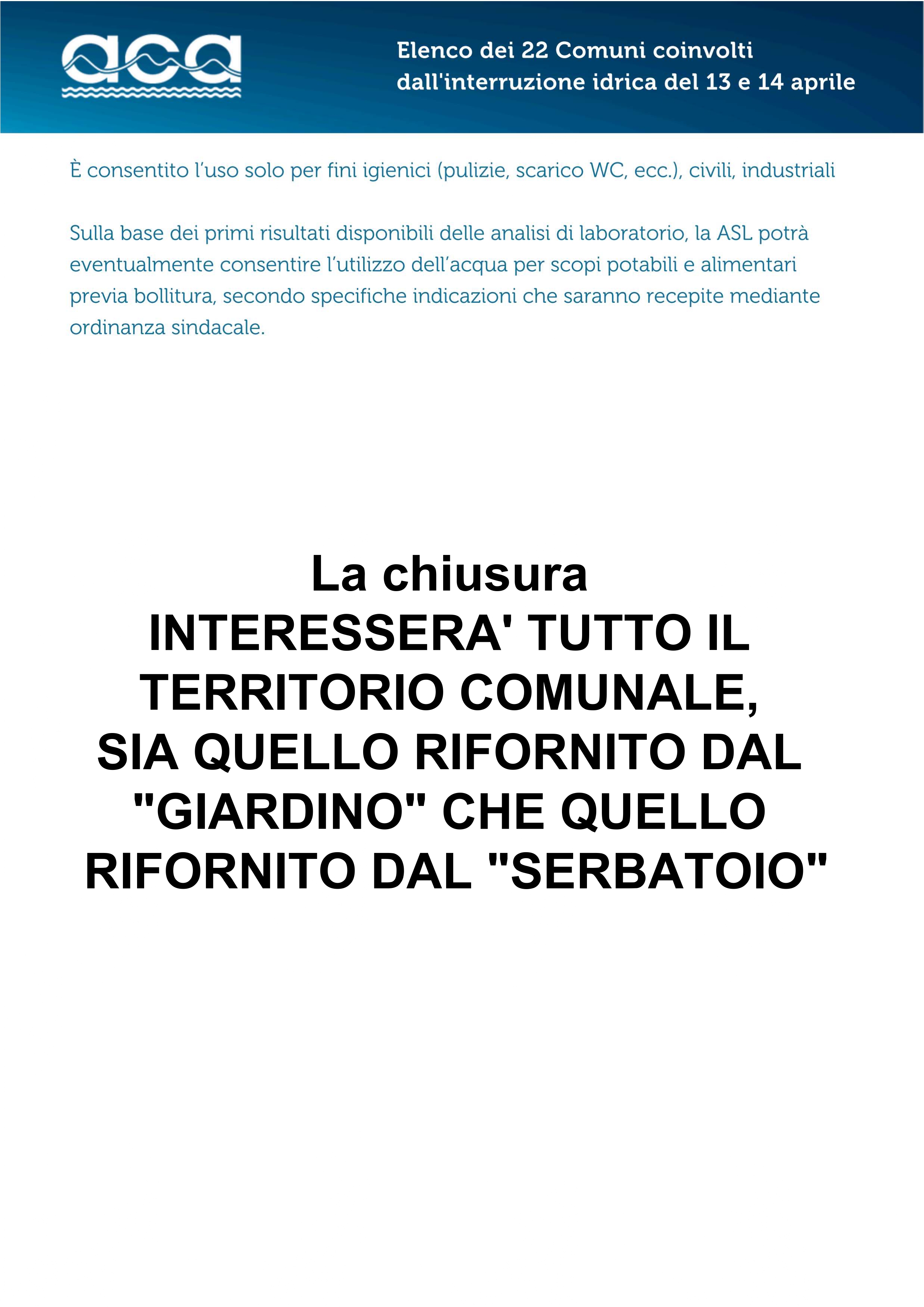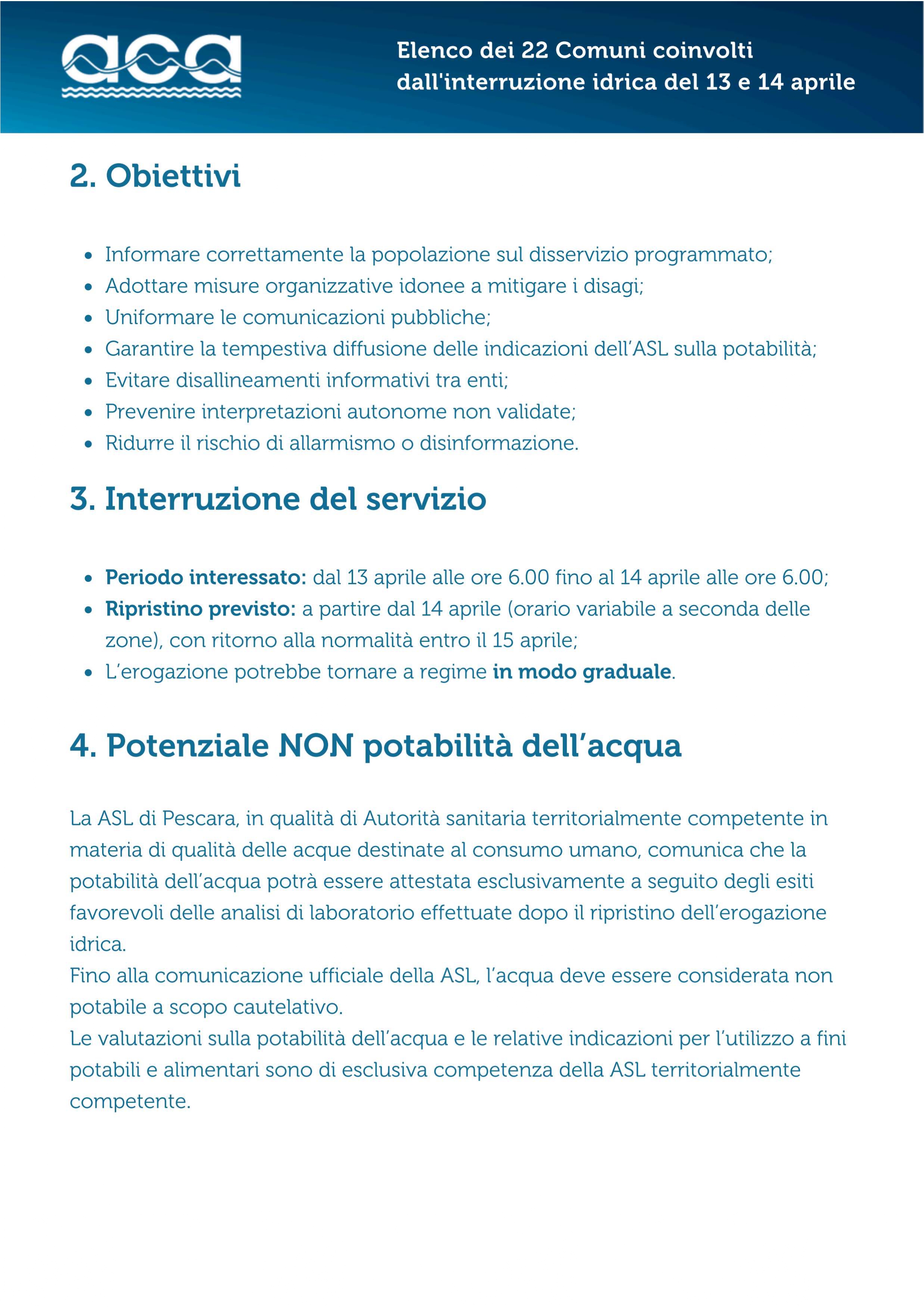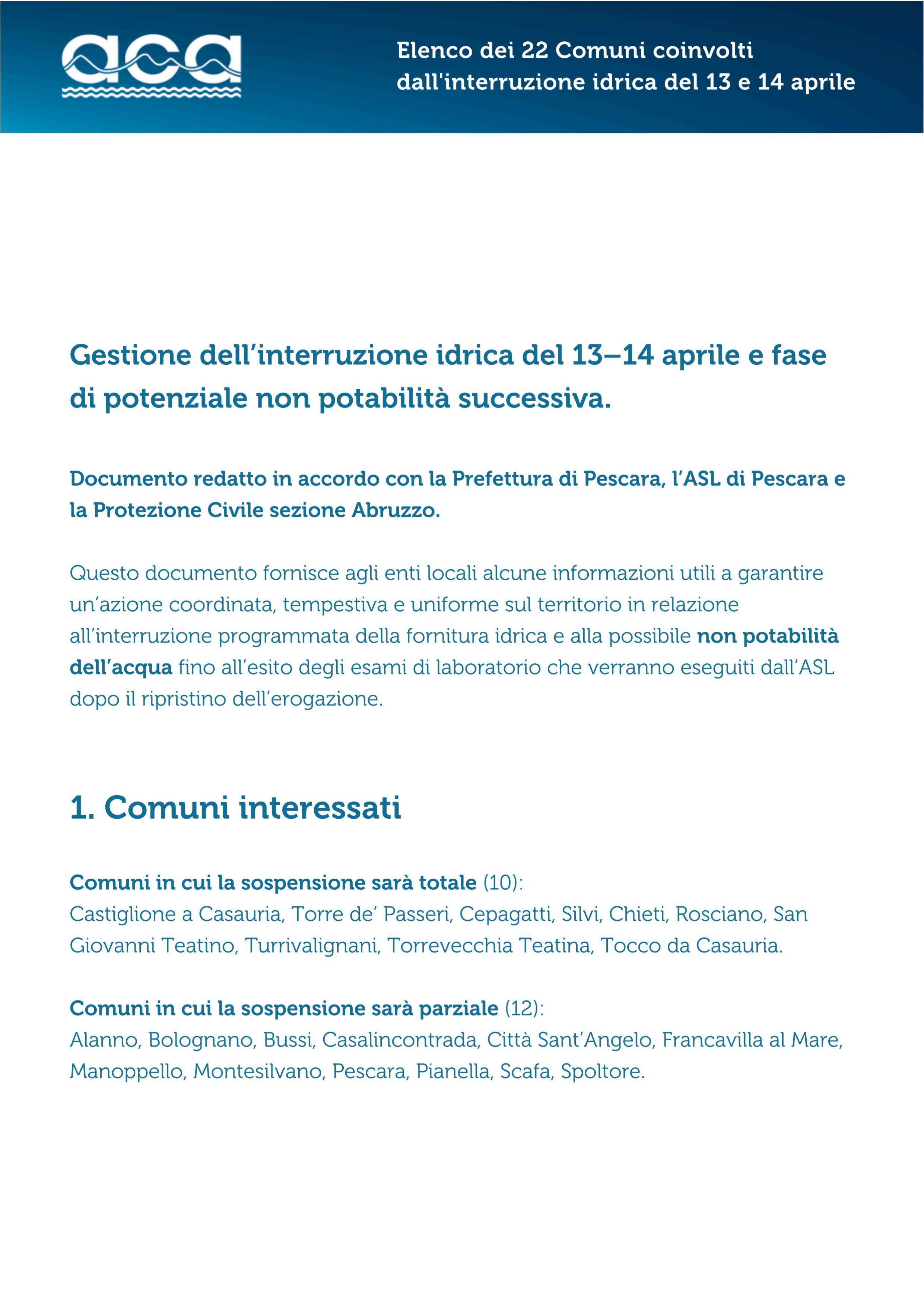 In merito agli annunciati interventi di manutenzione straordinaria e potenziamento delle reti sulla condotta Giardino, si comunica all'utenza l'estratto di un vademecum redatto da ACA in accordo con la Prefettura di Pescara, l’ASL di Pescara e la Protezione Civile sezione Abruzzo per la gestione dell'interruzione idrica del 13-14 aprile 2026.