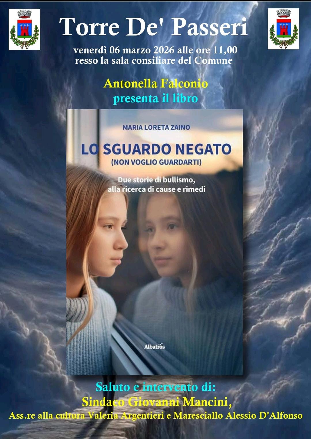 "Lo sguardo negato-Non voglio guardarti" è il titolo del libro, scritto da Maria Loreta Zaino, che sarà presentato venerdì 6 marzo 2026 alle ore 11 nella sala consiliare del Comune di Torre de' Passeri.