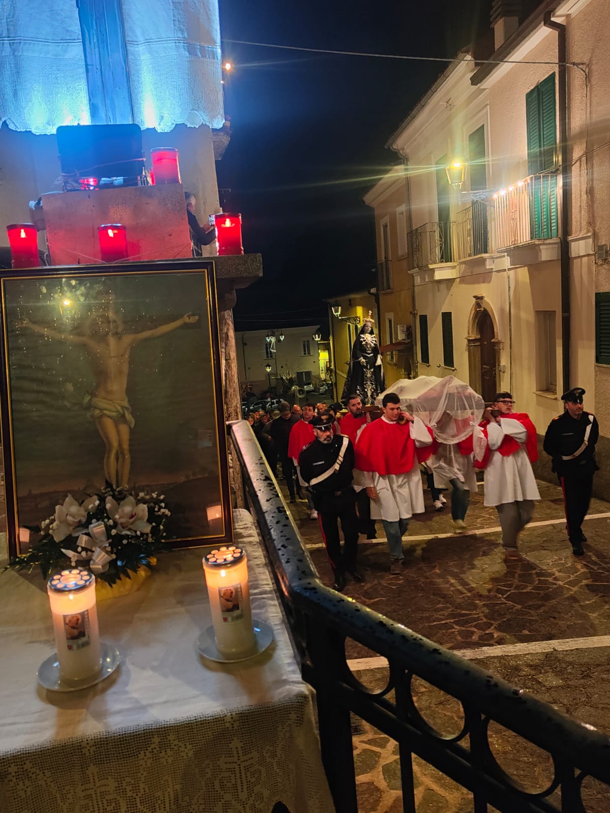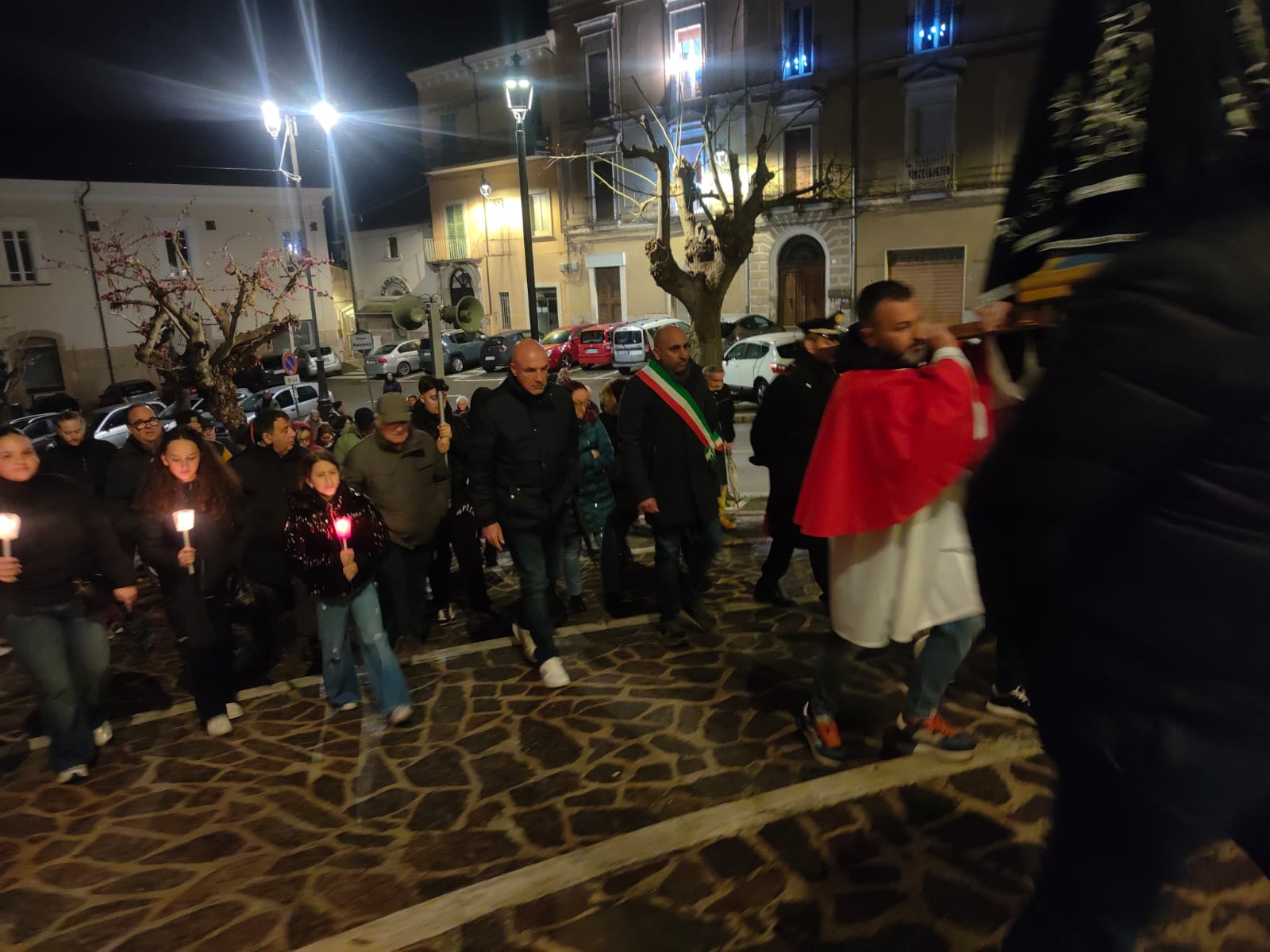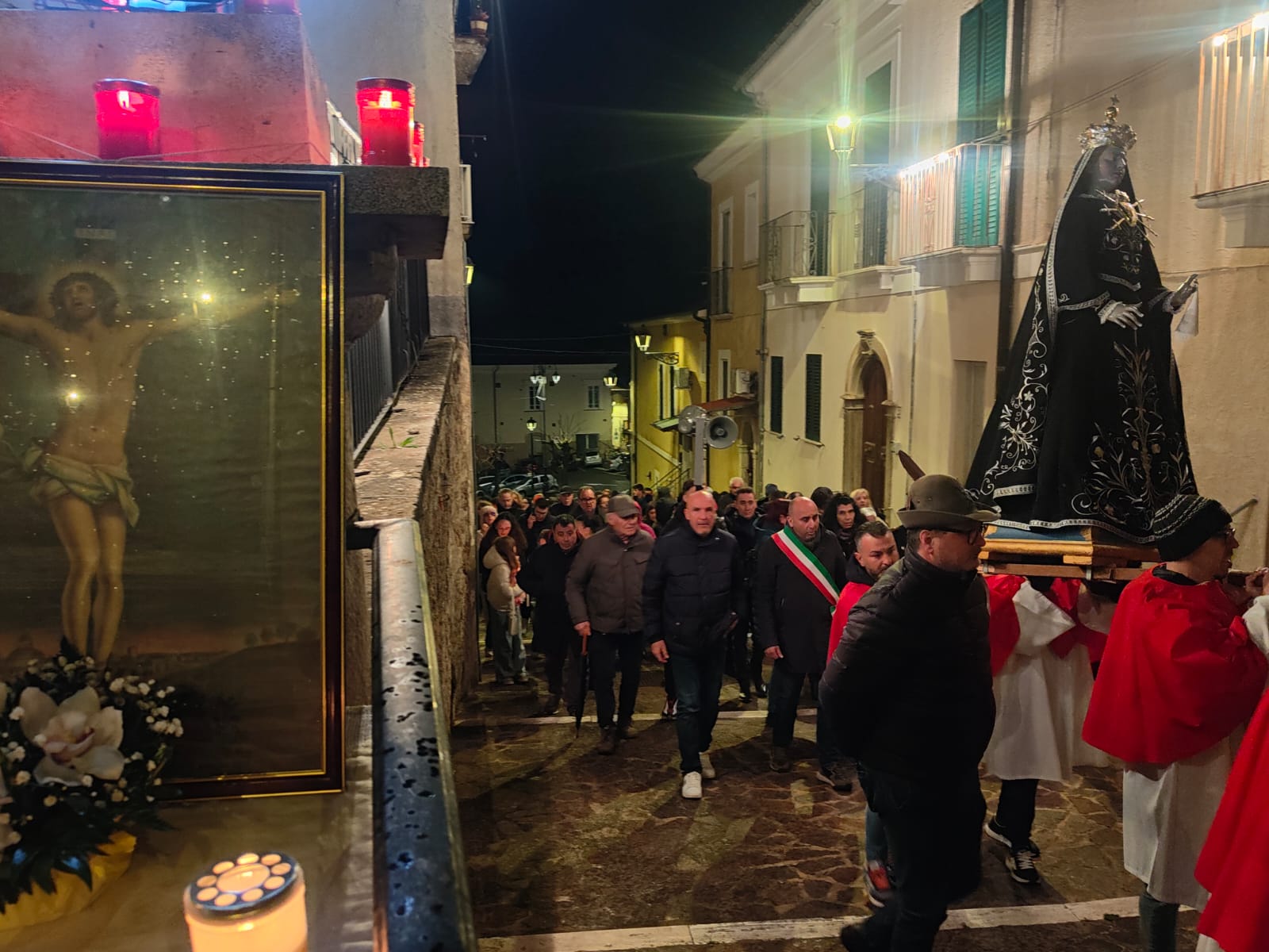 Il sindaco Giovanni Mancini, affiancato dal vice Piero Di Giulio, dall'assessore Antonio Caldarelli, dai consiglieri Lia Dell'Oso, Manuela Cordesco e Silvio De Dominicis, ha partecipato, emozionato, alla processione del Cristo Morto circondato da una folla di centinaia di persone, commossa e silente. Accanto a lui il comandante della stazione dei carabinieri, il maresciallo maggiore Alessio D'Alfonso. Il corteo, illuminato dalla luce delle fiaccole, è stato aperto dalle letture del parroco della chiesa della Beata Vergine Maria delle Grazie, don Matteo Mosca, attorniato dai tanti giovani del paese e con il gruppo alpini.