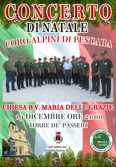Il coro degli alpini di Pescara in concerto venerdì 19 dicembre 2025 alle ore 21 nella chiesa Beata Vergine Maria delle Grazie, in piazza Plebiscito. L'evento è coordinato dal Gruppo Alpini di Torre de' Passeri. Sarà un momento di grande intensità e partecipazione a pochi giorni dal Natale. Vi aspettiamo in tanti!!