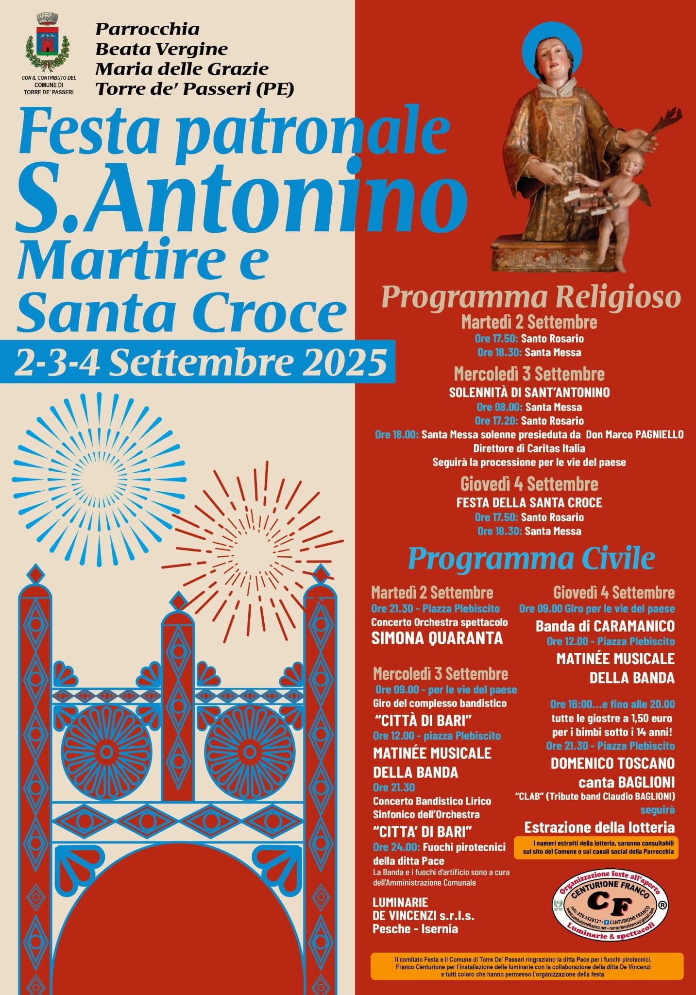 Auguro a tutti voi, cittadini e ospiti, di trascorrere ore liete e serene a Torre de' Passeri, il paese di Sant'Antonino martire e Santa Croce.