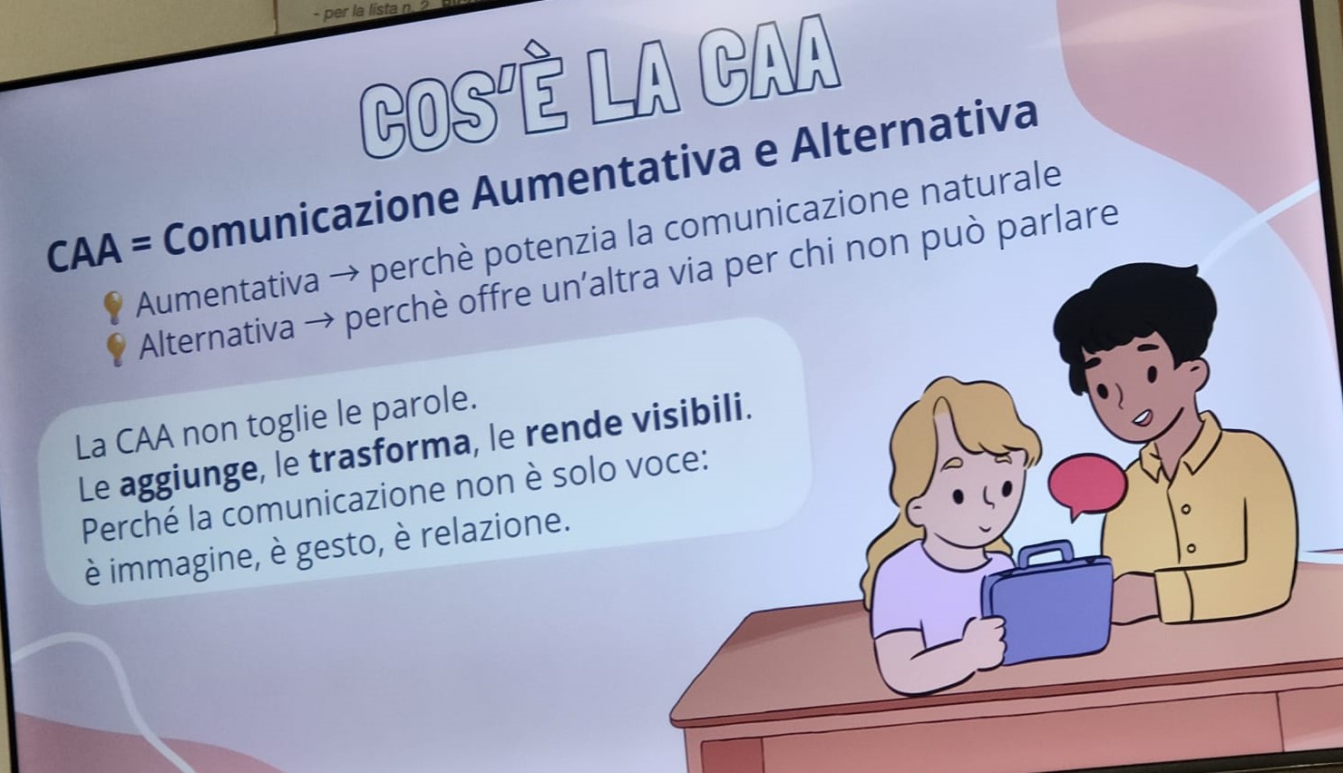 Puntare il dito su una immagine, riprodotta su una griglia, per esprimere un pensiero o una necessità. Si chiama CAA (Comunicazione Aumentativa Alternativa) il progetto di sensibilizzazione, nato negli Usa anni fa, e sbarcato ieri anche a Torre de' Passeri per volontà dell'amministrazione comunale.