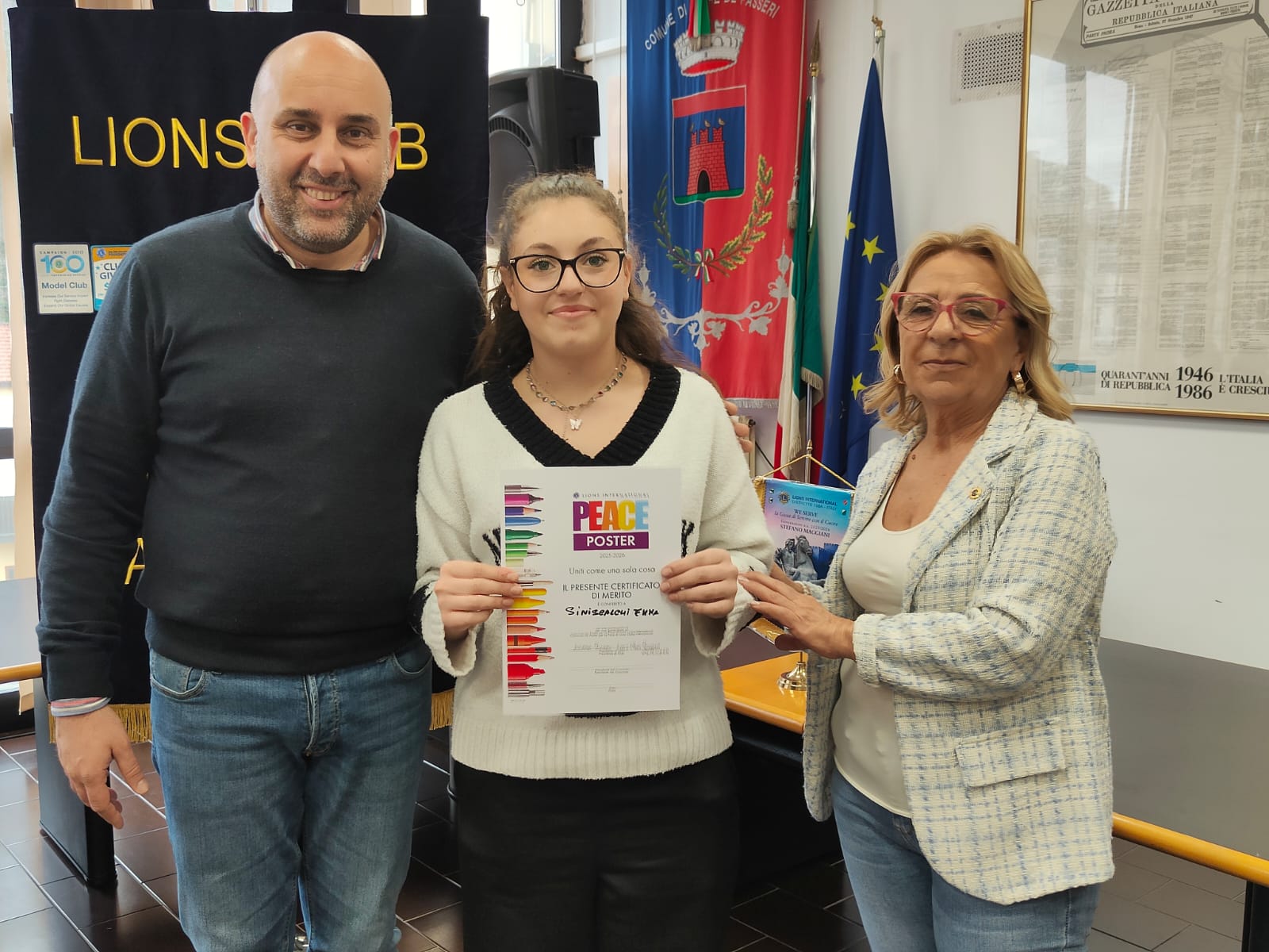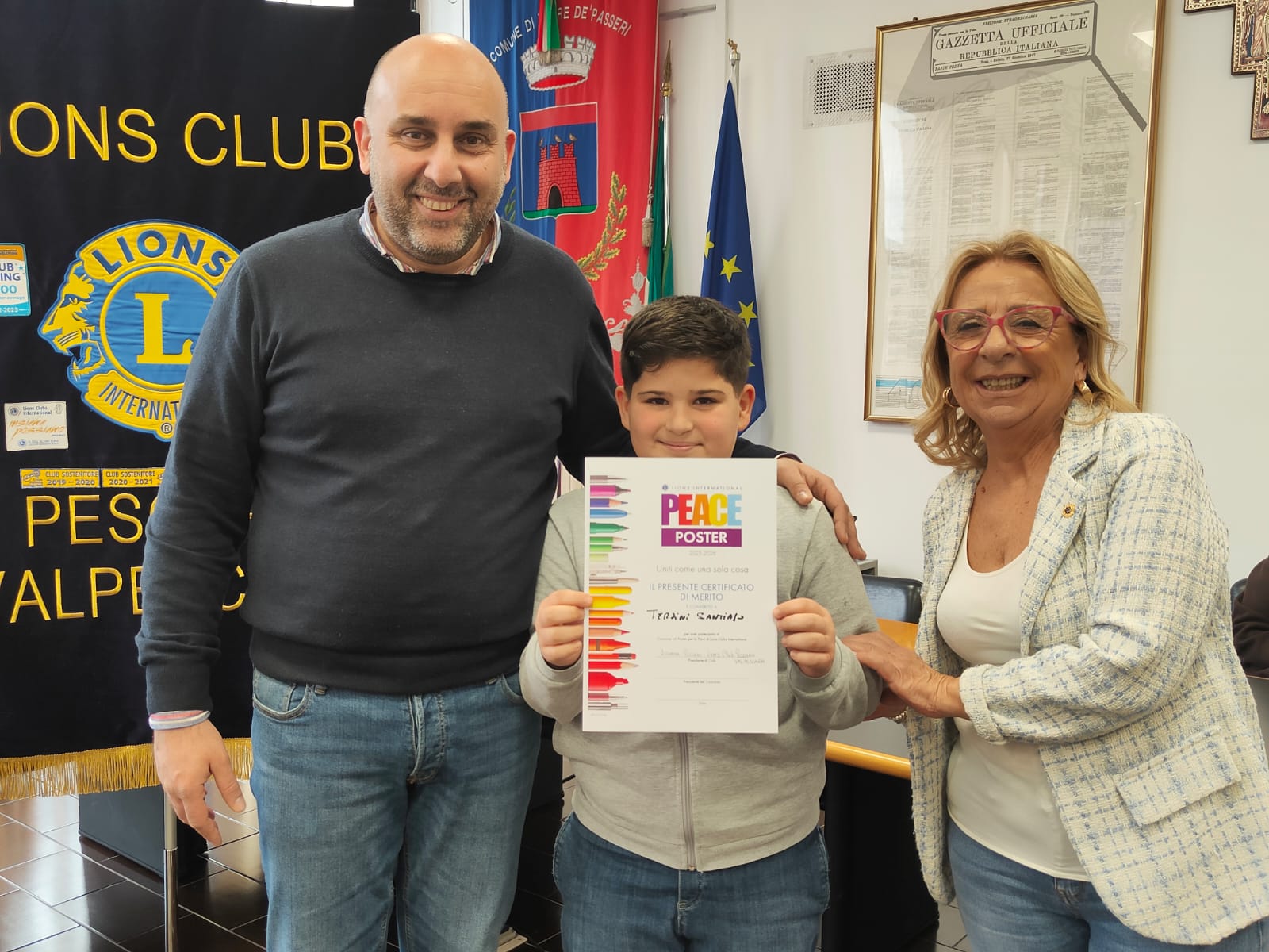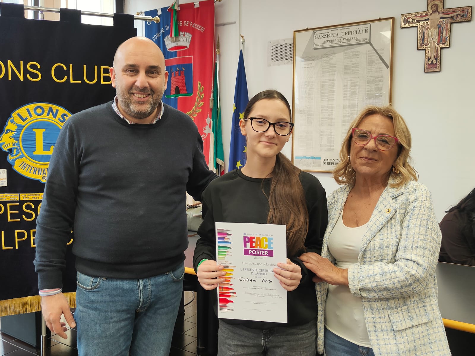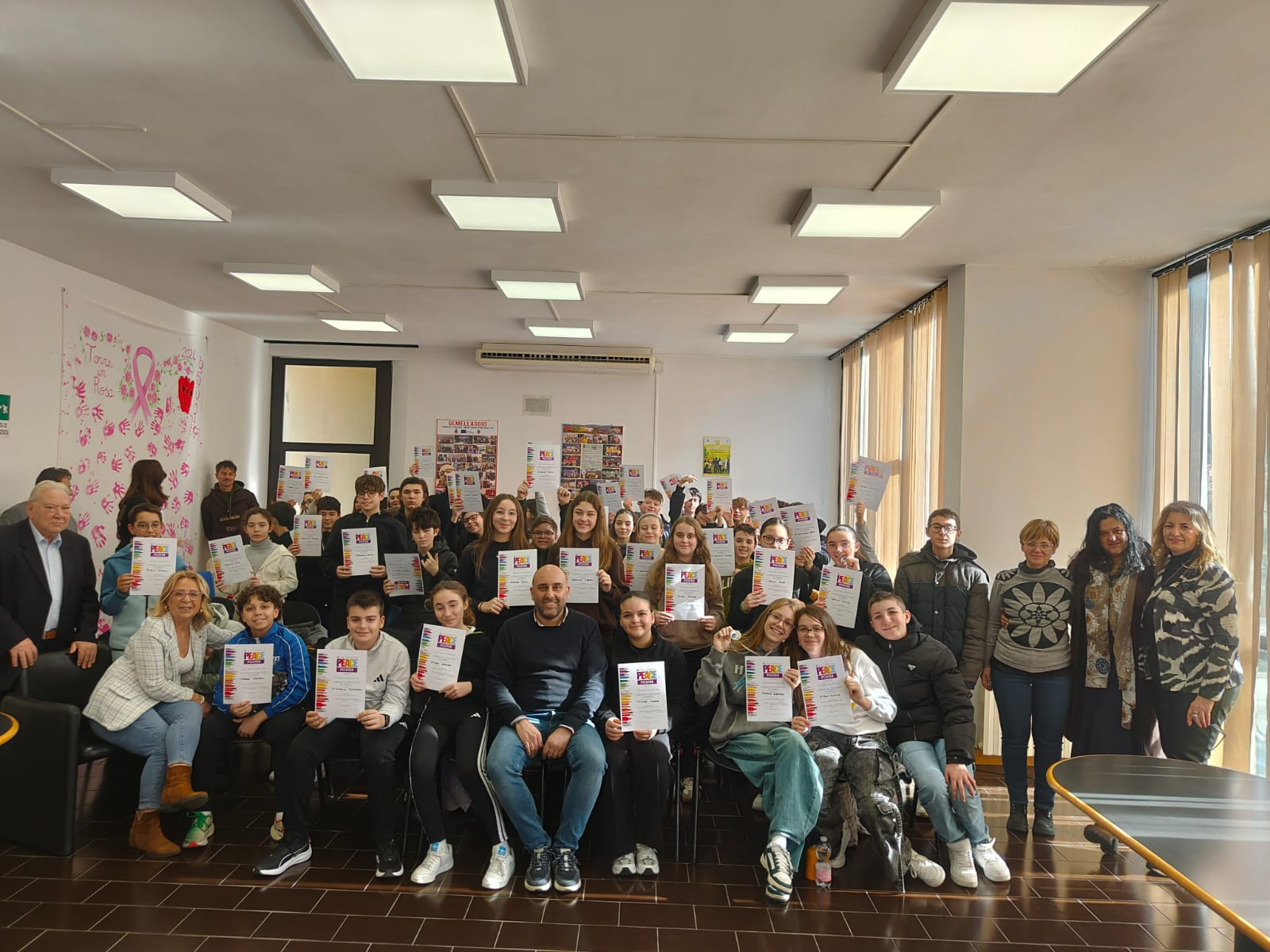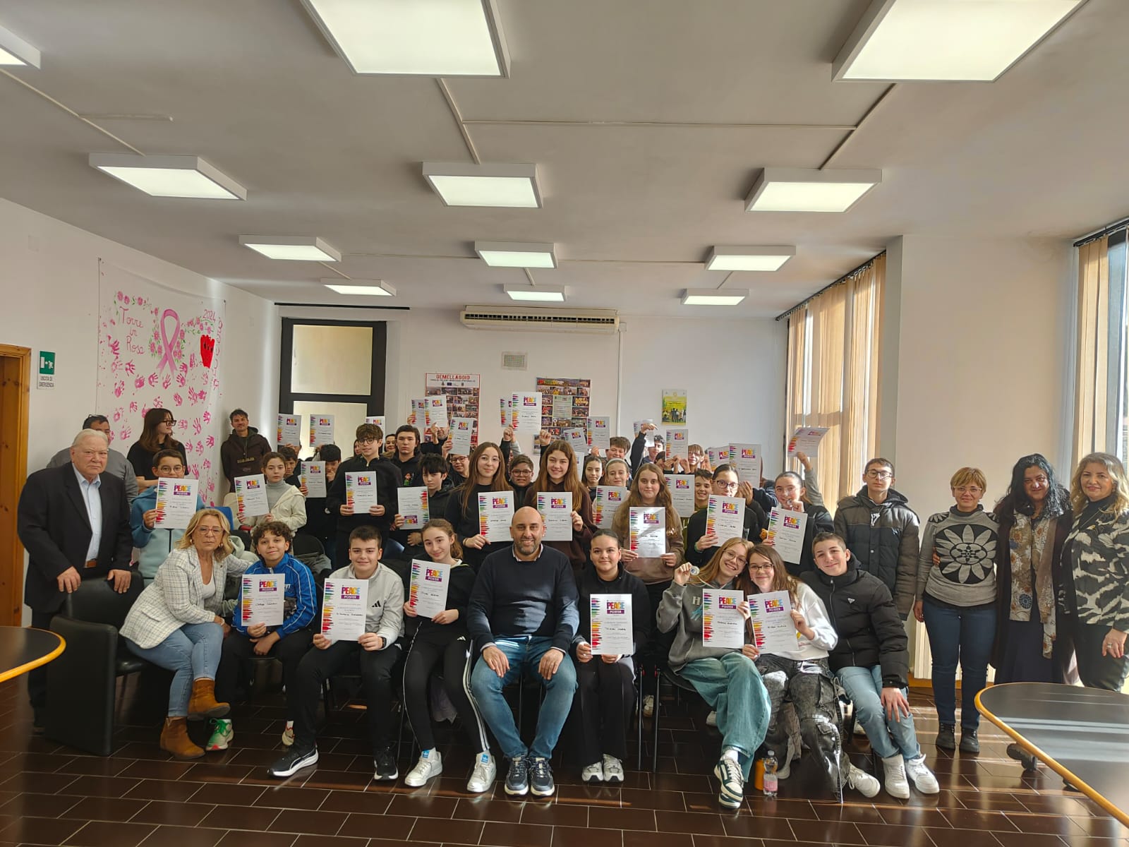 Trentatre alunni del comprensivo "Alberto Manzi" di Torre de' Passeri sono stati premiati dal sindaco Giovanni Mancini, affiancato dall'assessore alla Cultura, Valeria Argentieri e dal consigliere Silvio De Dominicis, nel corso della cerimonia "Un poster per la pace", storico concorso internazionale dal titolo evocativo "Uniti come una cosa sola" (edizione 2026) svoltasi stamani nella sala Consiliare del Comune.