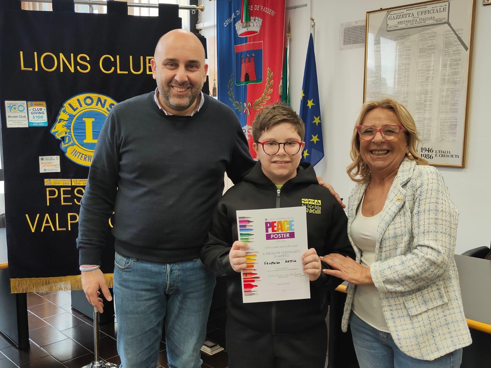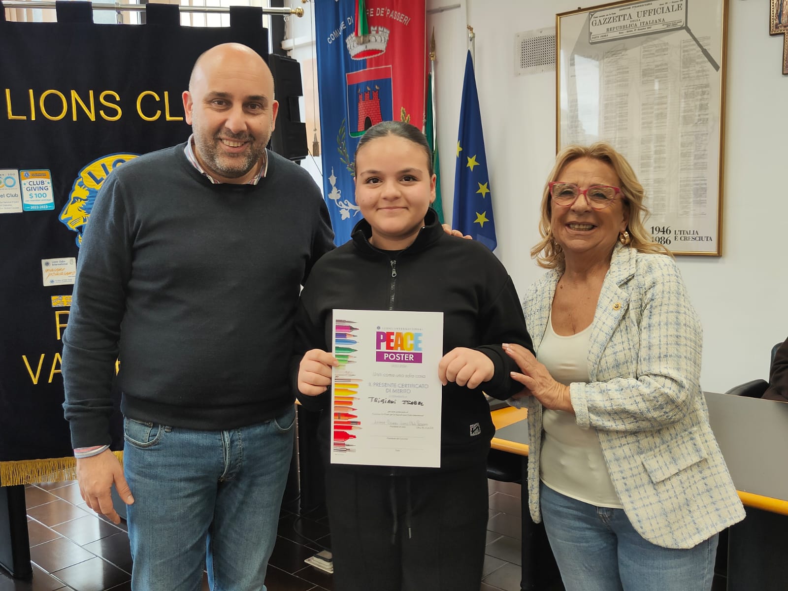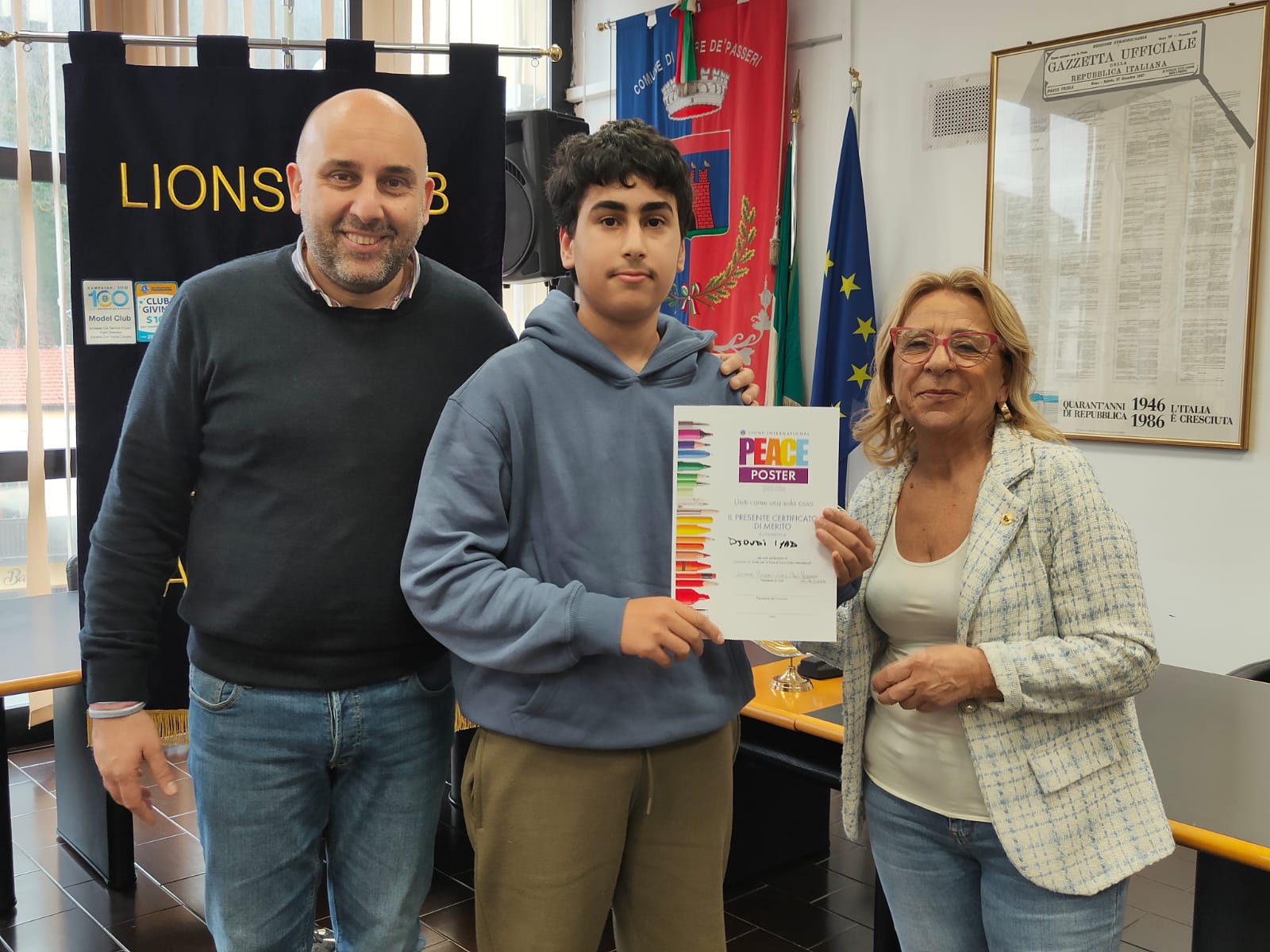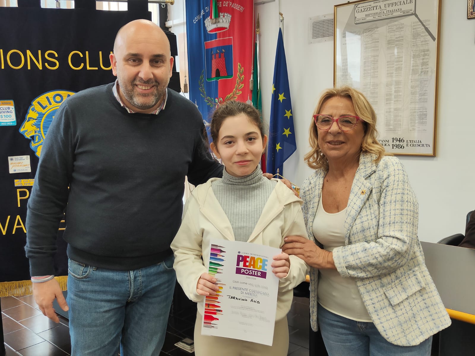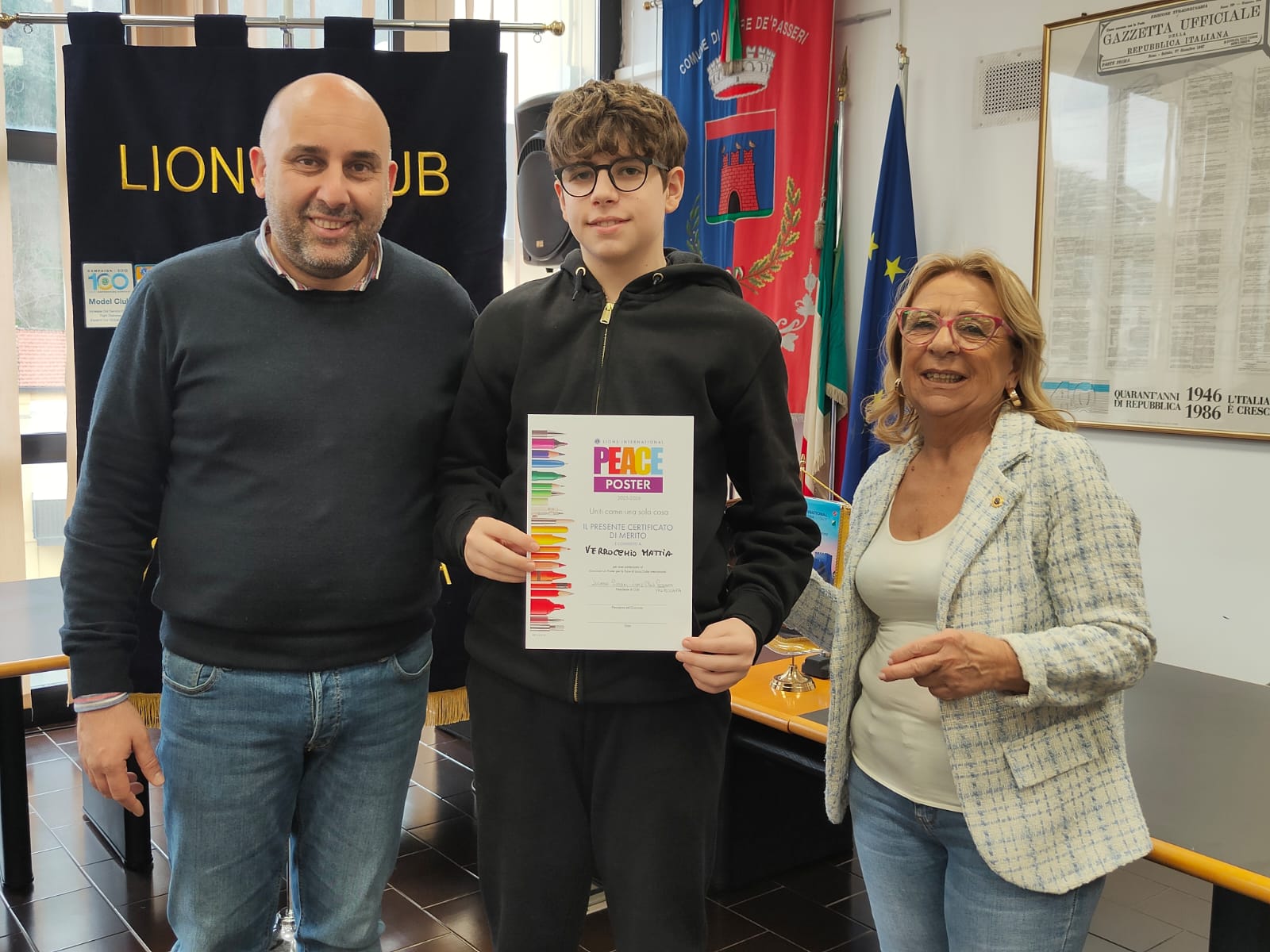 Trentatre alunni del comprensivo "Alberto Manzi" di Torre de' Passeri sono stati premiati dal sindaco Giovanni Mancini, affiancato dall'assessore alla Cultura, Valeria Argentieri e dal consigliere Silvio De Dominicis, nel corso della cerimonia "Un poster per la pace", storico concorso internazionale dal titolo evocativo "Uniti come una cosa sola" (edizione 2026) svoltasi stamani nella sala Consiliare del Comune.