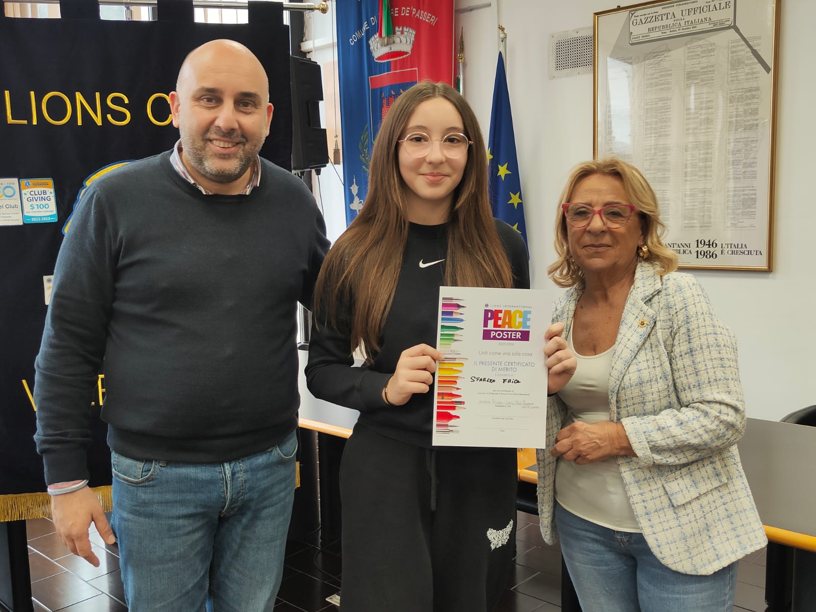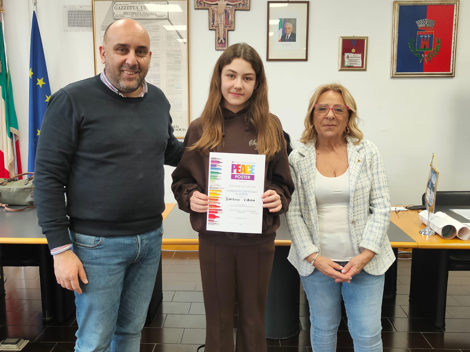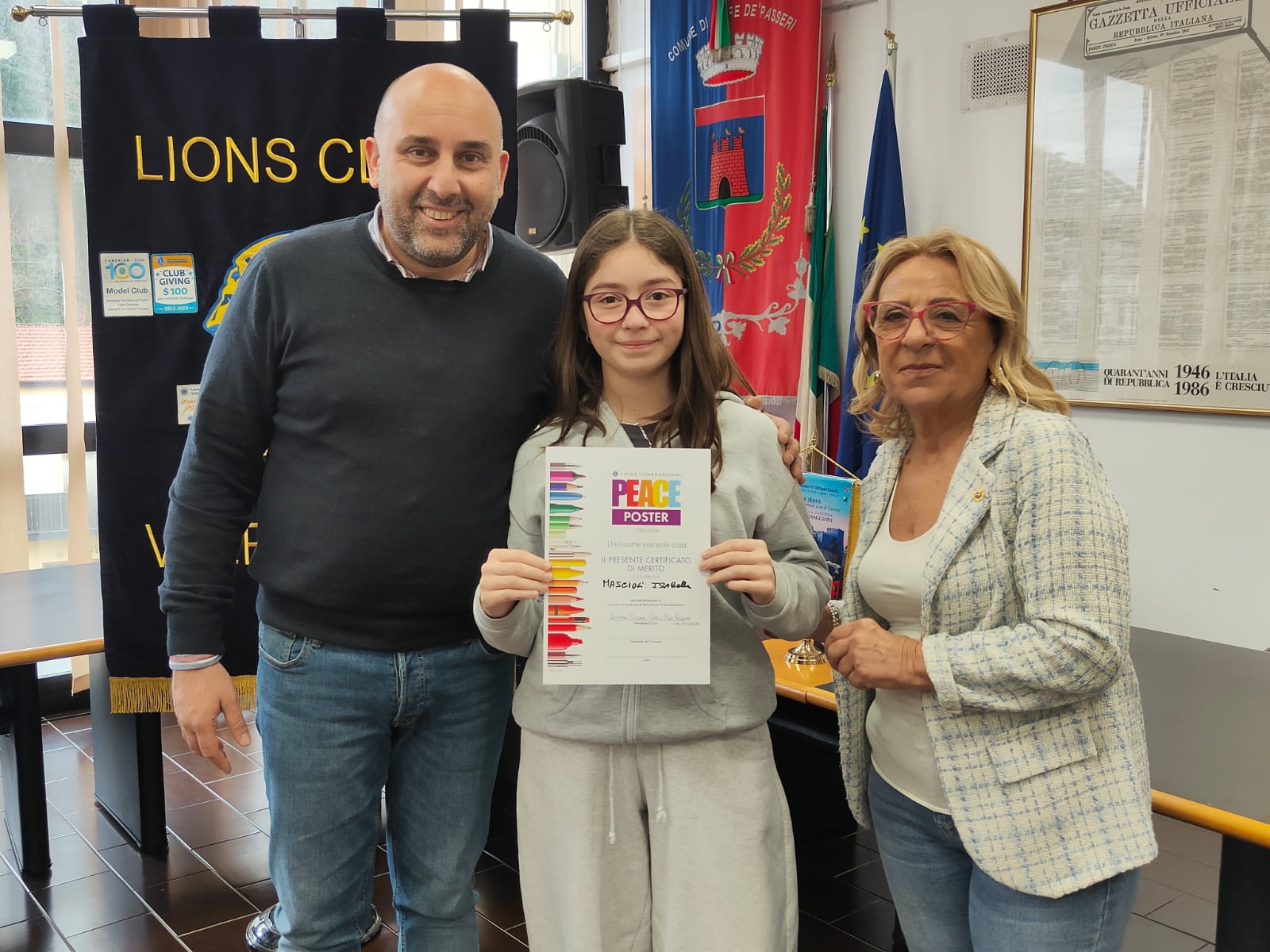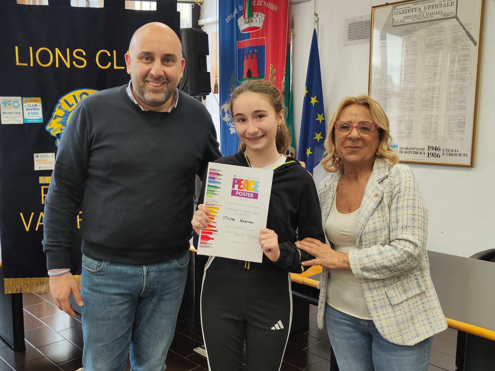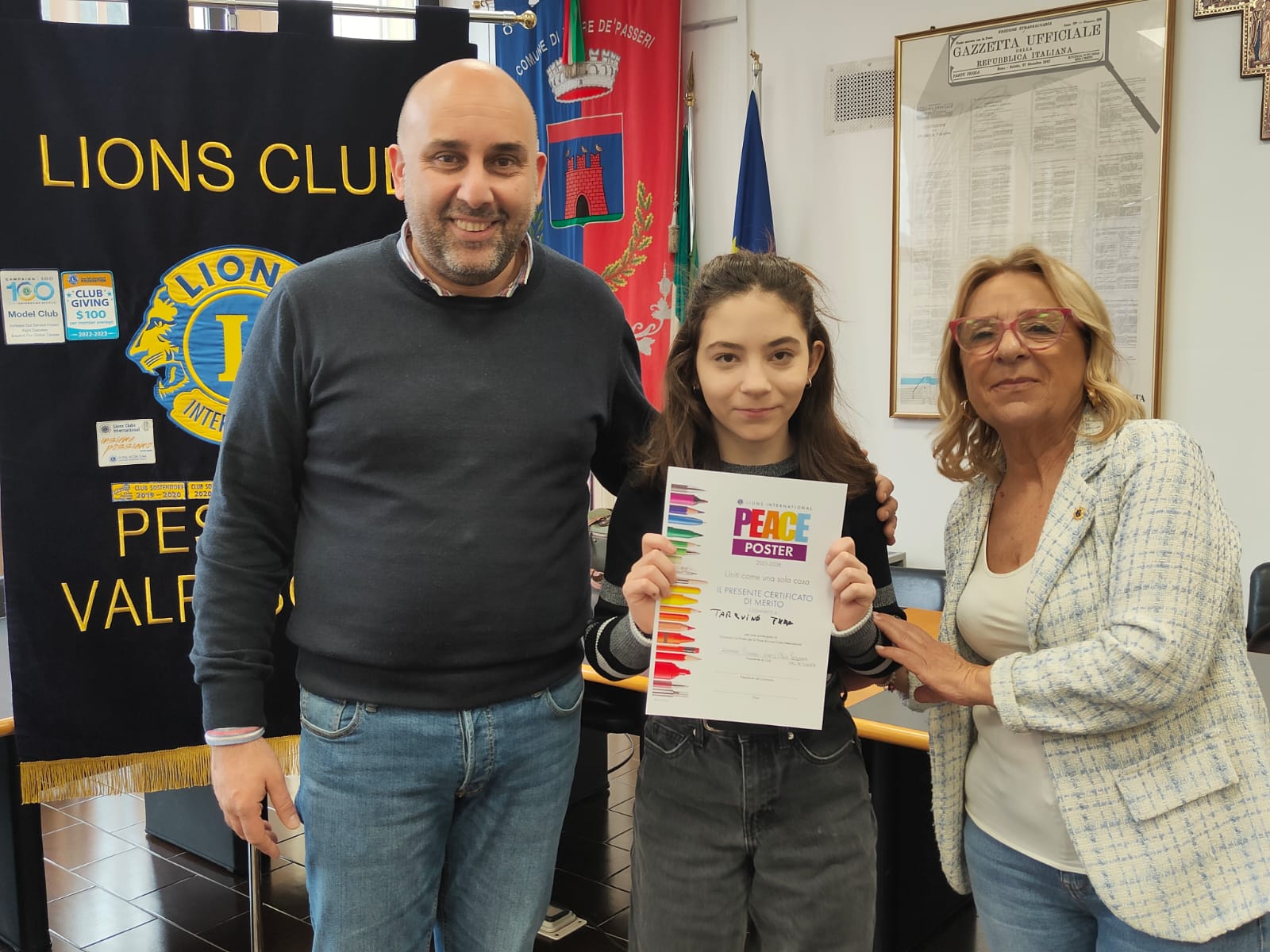Trentatre alunni del comprensivo "Alberto Manzi" di Torre de' Passeri sono stati premiati dal sindaco Giovanni Mancini, affiancato dall'assessore alla Cultura, Valeria Argentieri e dal consigliere Silvio De Dominicis, nel corso della cerimonia "Un poster per la pace", storico concorso internazionale dal titolo evocativo "Uniti come una cosa sola" (edizione 2026) svoltasi stamani nella sala Consiliare del Comune.