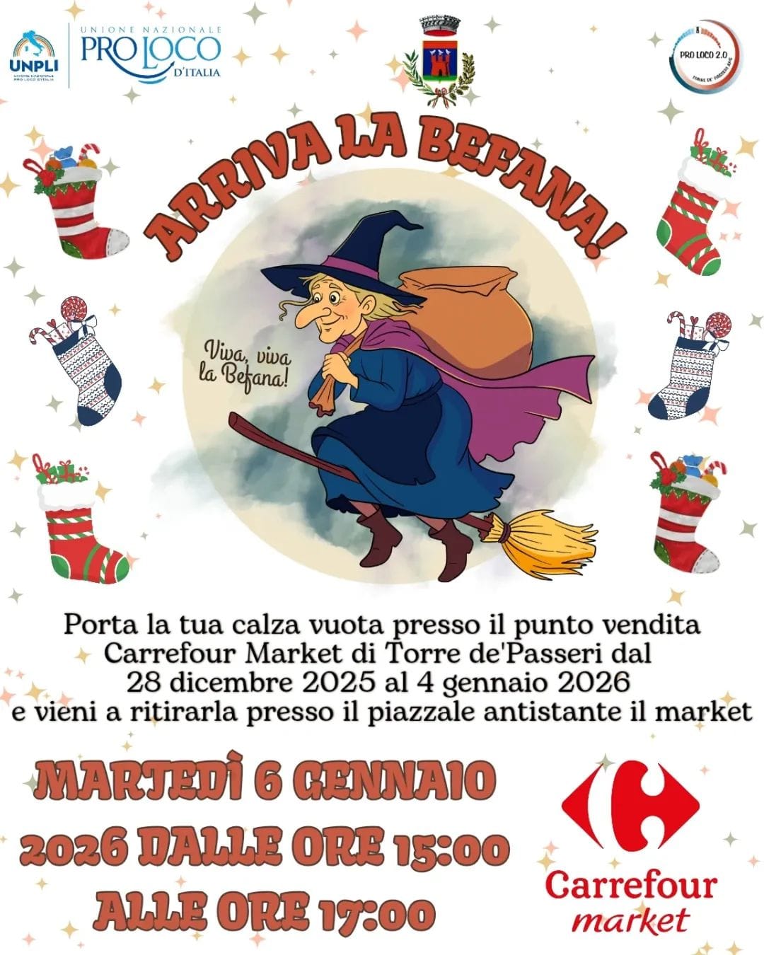 Attenzione, messaggio ai genitori: ssshhh.... portate la calza vuota fino al 4 gennaio al punto vendita Carrefour Market di Torre de' Passeri e poi ci rivediamo tutti il 6 gennaio dalle ore 15 alle ore 17 al piazzale Carrefour!