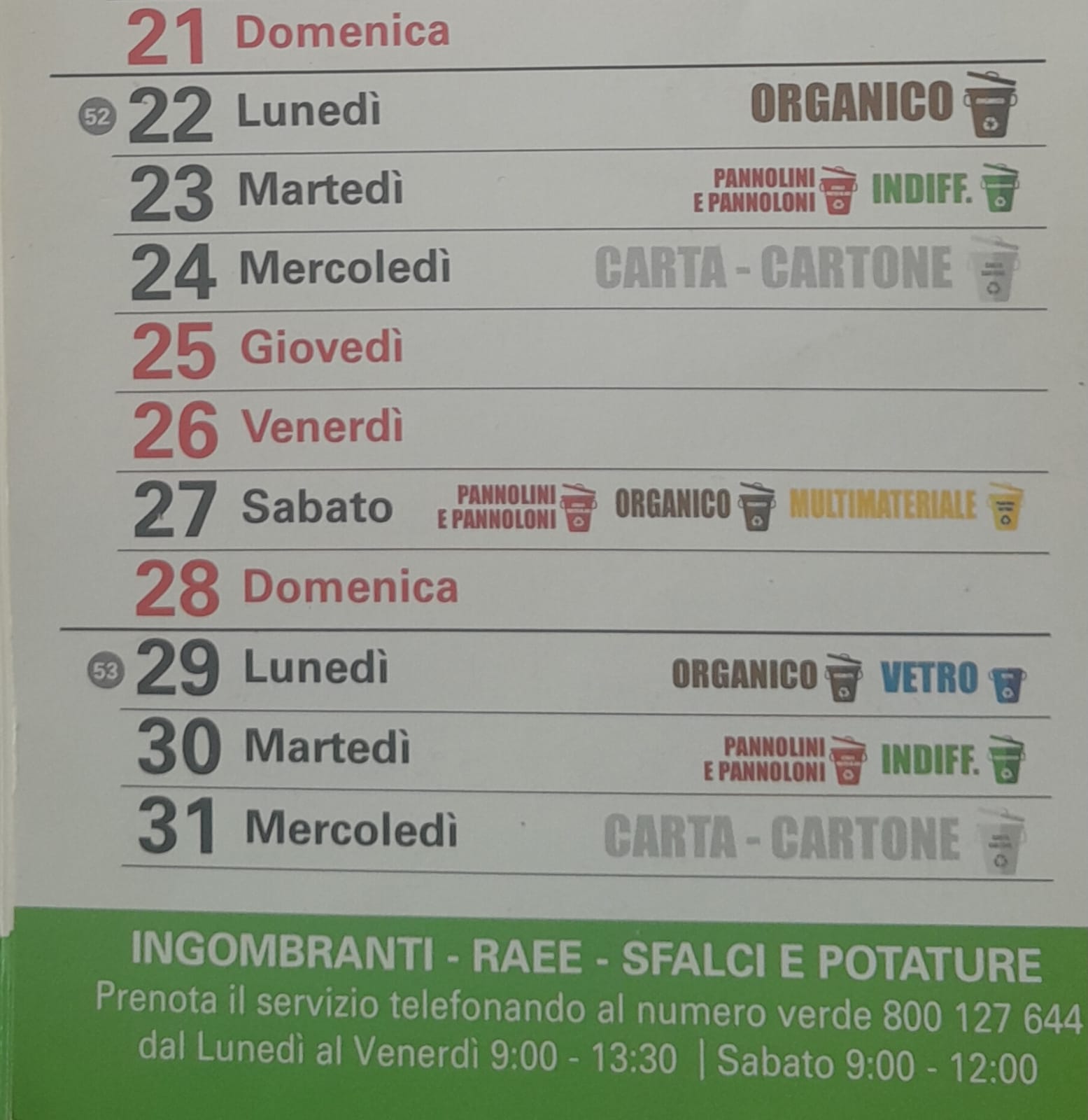 -Martedì 23 dicembre saranno raccolti pannolini, pannoloni e indifferenziato